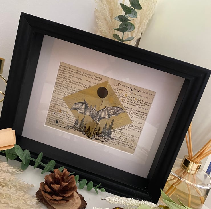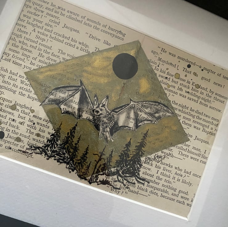 This is an original piece of art incorporating recycled book pages from damaged books. It depicts a bat flying over a forest and is drawn in pencil and charcoal and incorporates gold ink.