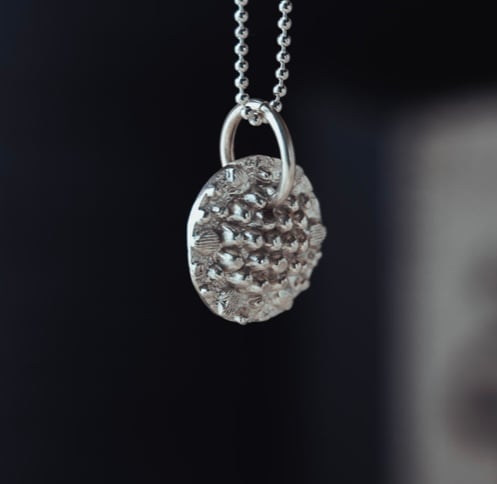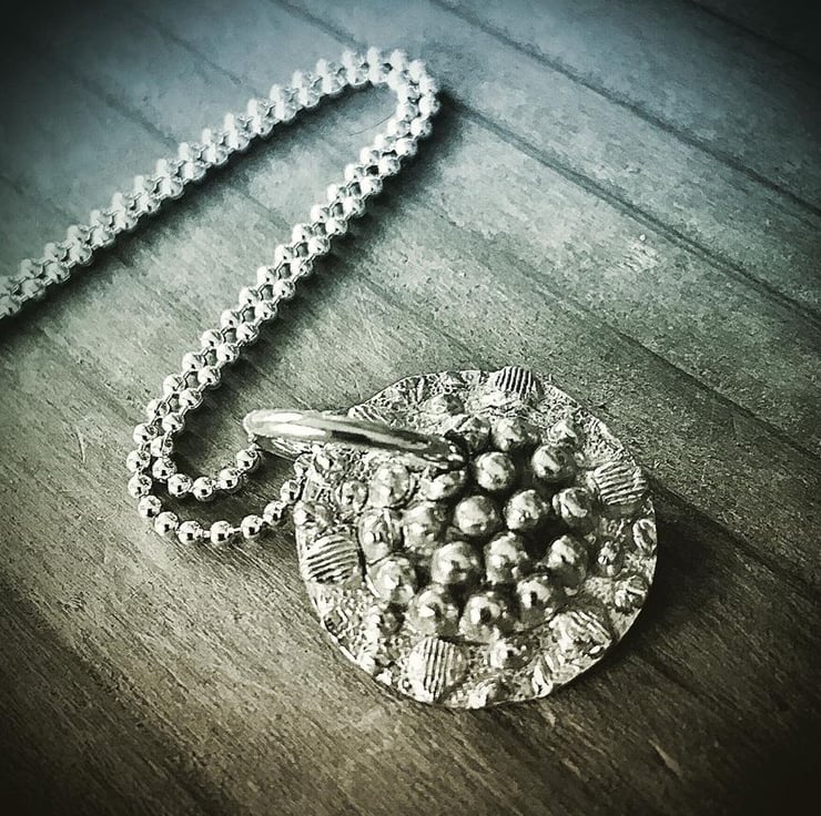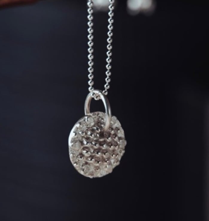 This natural textured sterling silver pendant hangs on a 18 inch silver chain that sparkles when it catches the light. It is made entirely from recycled silver and is a very tactile piece. It can be layered, worn with matching pieces or as a stand alone piece.