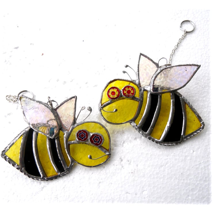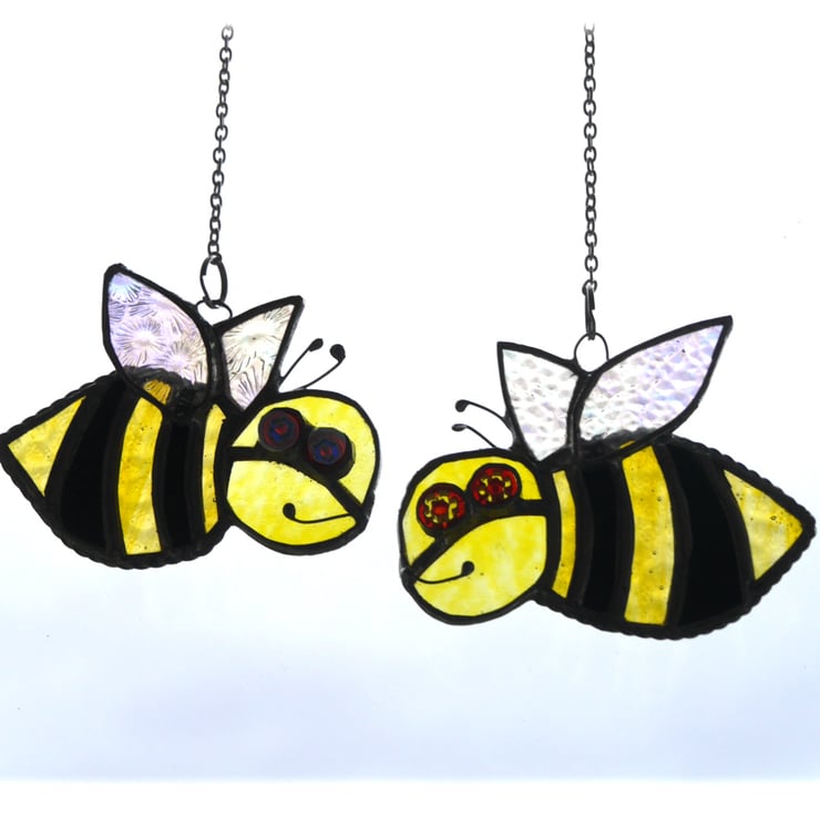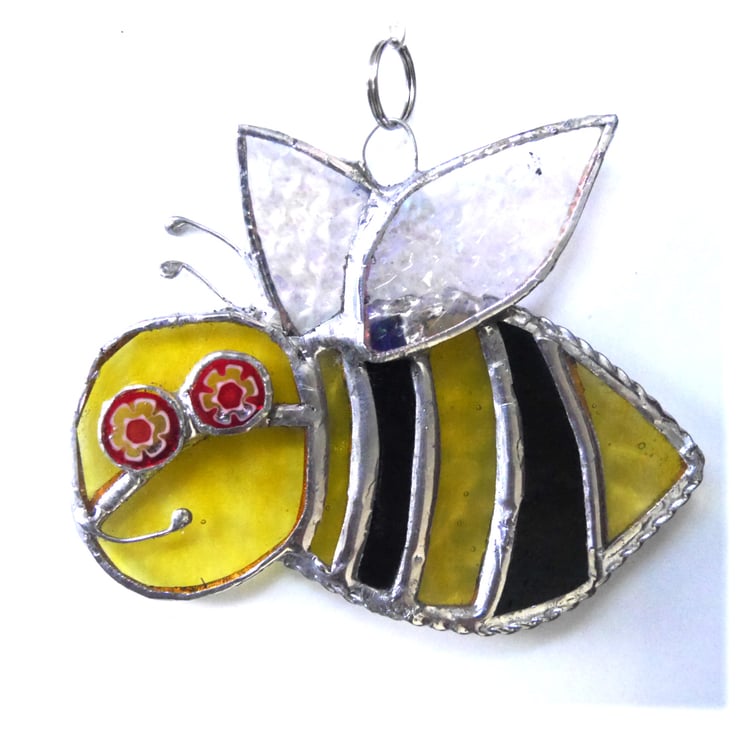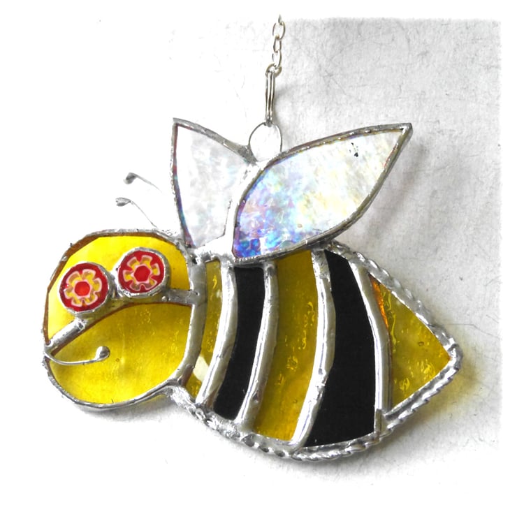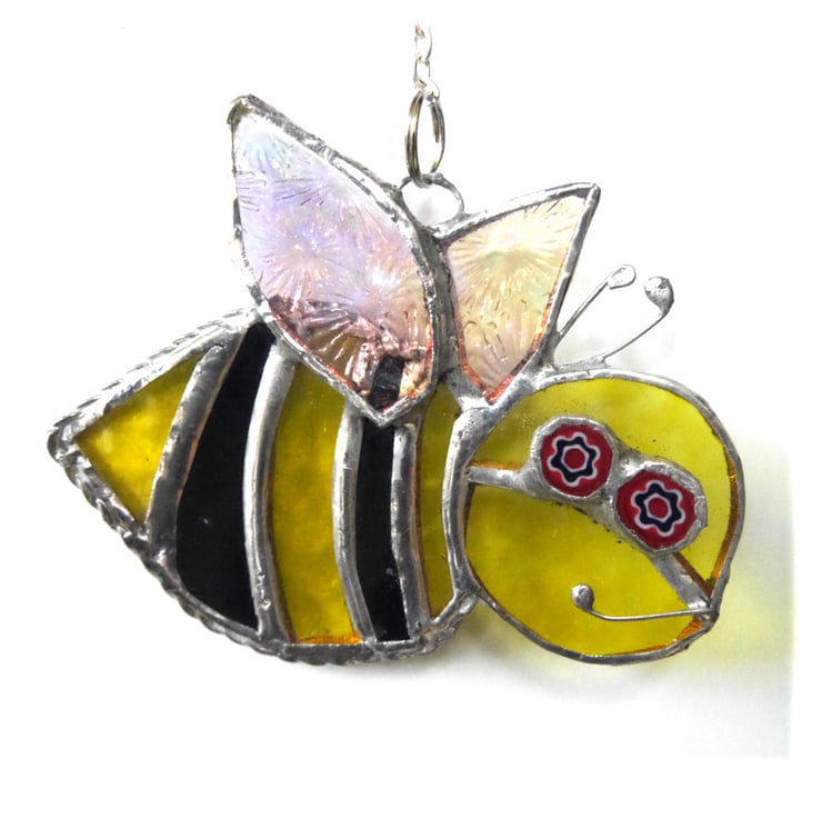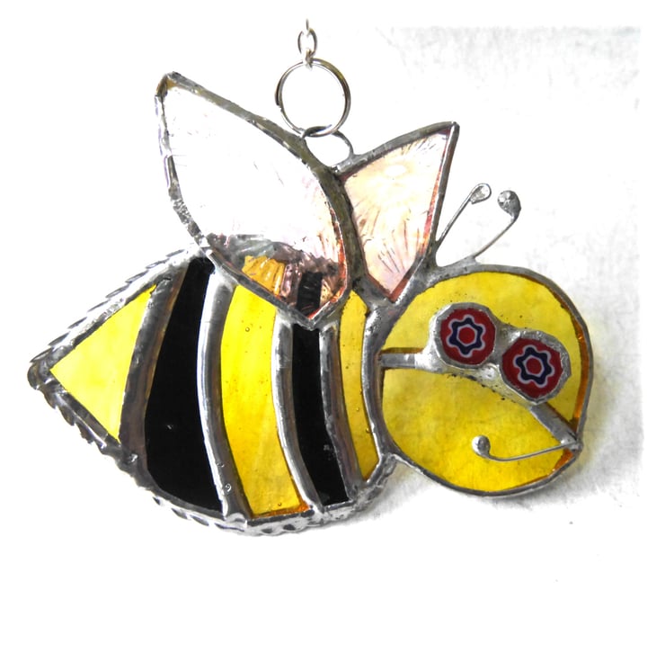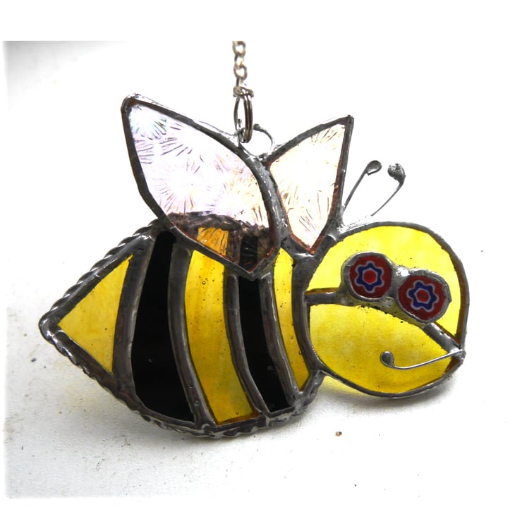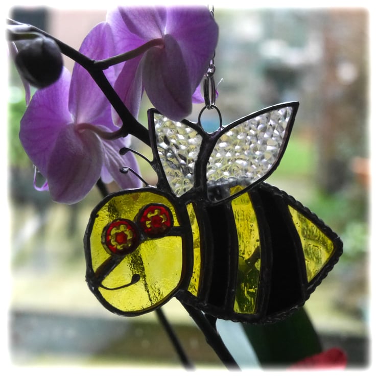 The bee hangs from silver chain securely attached to the top and looks as if it's buzzing in the window.