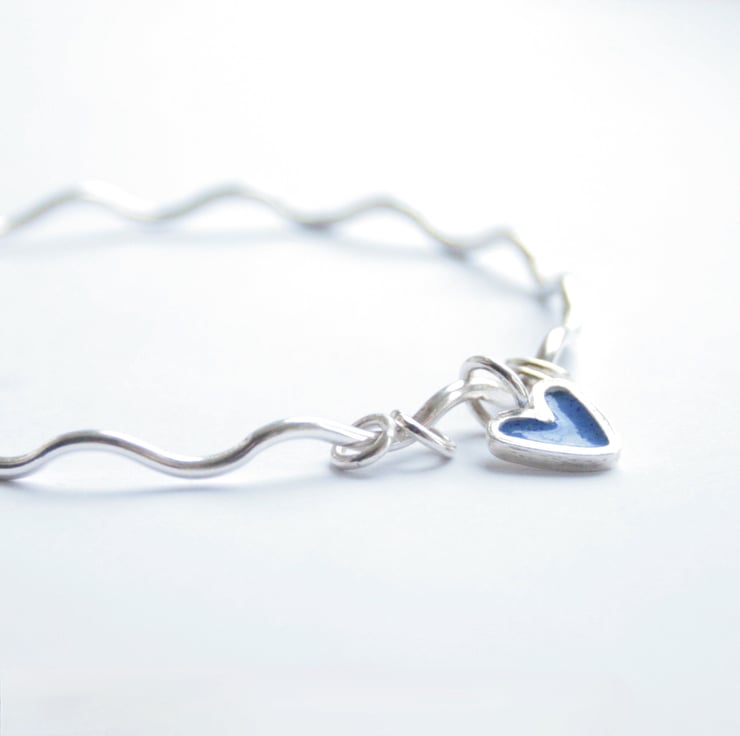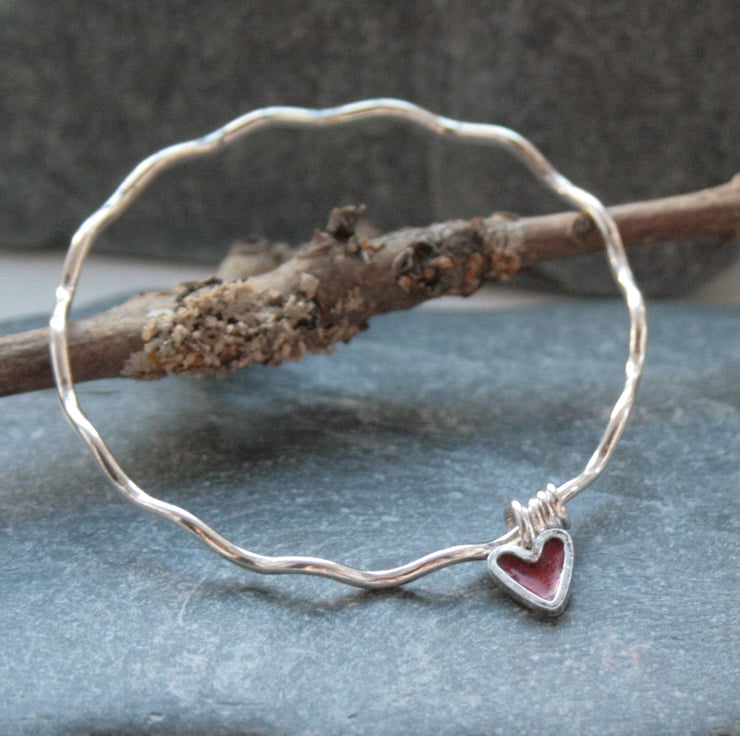 Silver charm bangle, sterling silver wavy bangle with enamel heart charm