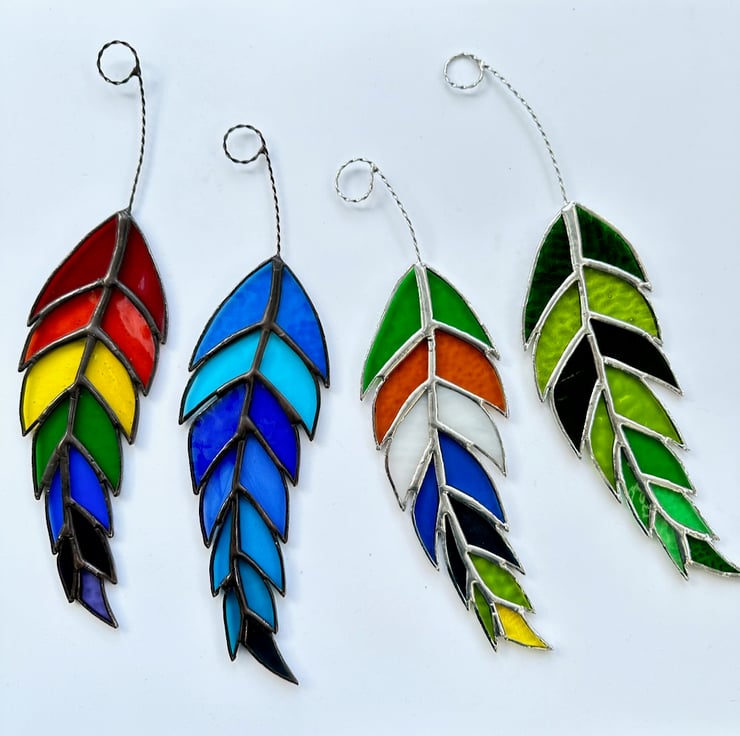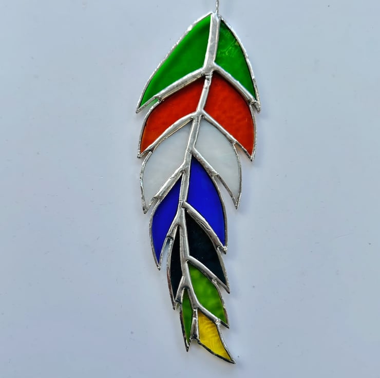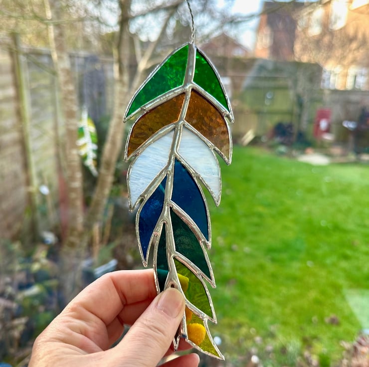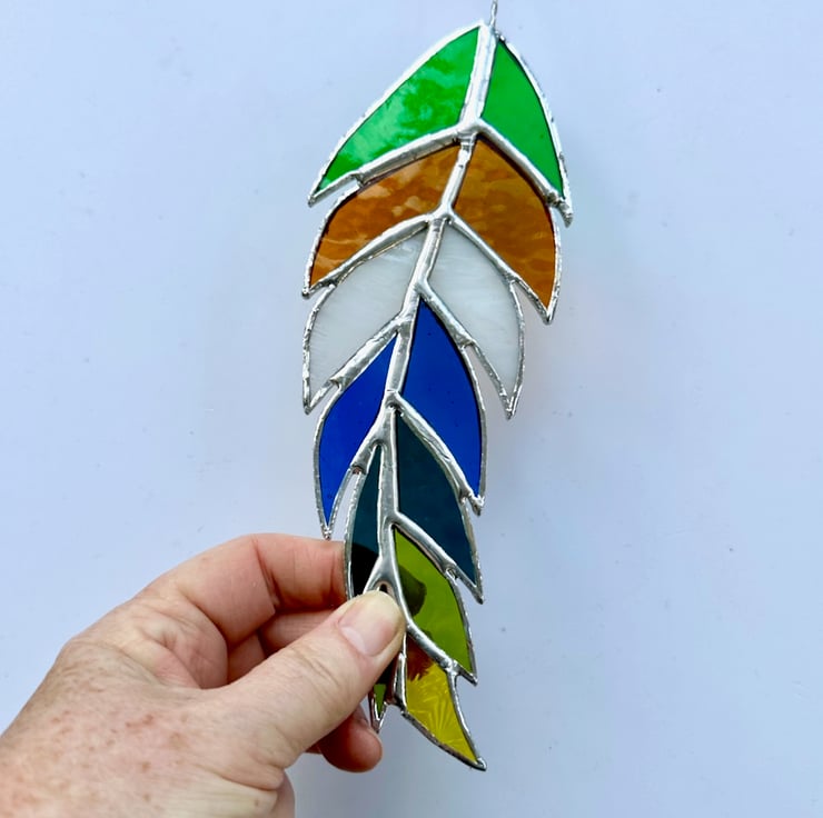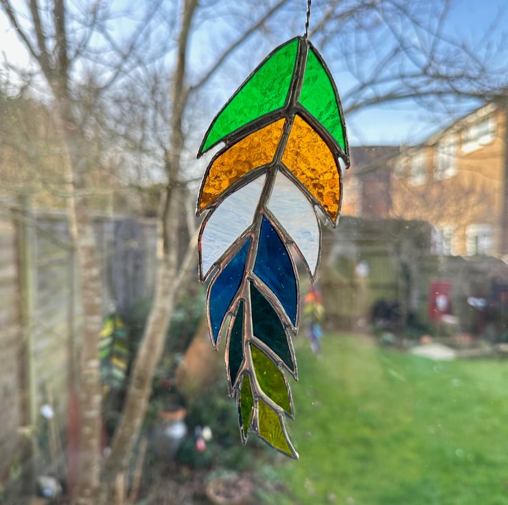 This feather has been made from 7 different types of colourful stained glass to represent a mallard duck. It will look beautiful in any window and doesn’t have to be in direct sunlight to look lovely.