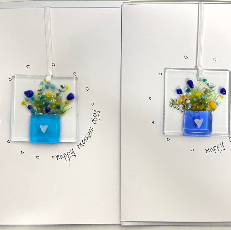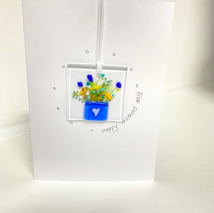 A gorgeous way to give a Mother’s Day card with a detachable hand crafted fused glass hanging . The fused glass flower pot decoration can be hung anywhere in the home and is approximately 2.5 inch square .