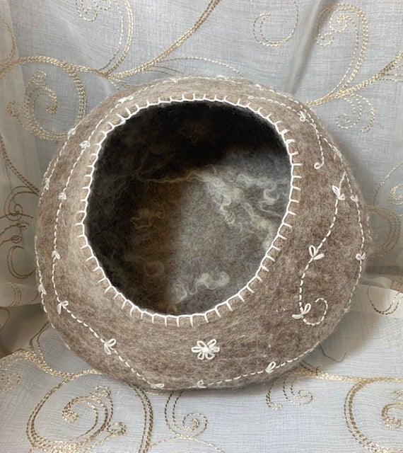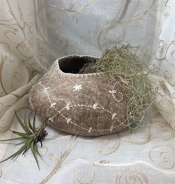 Lovely sturdy bowl made from the wet felting technique. After using soap and water to fuse the fibres, it is shaped, rinsed and dried. It has then been hand embroidered. It is an older piece listed for Seconds Sunday and just needs to find a new loving home :)