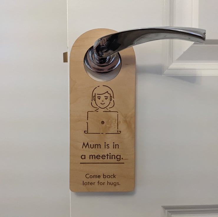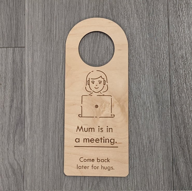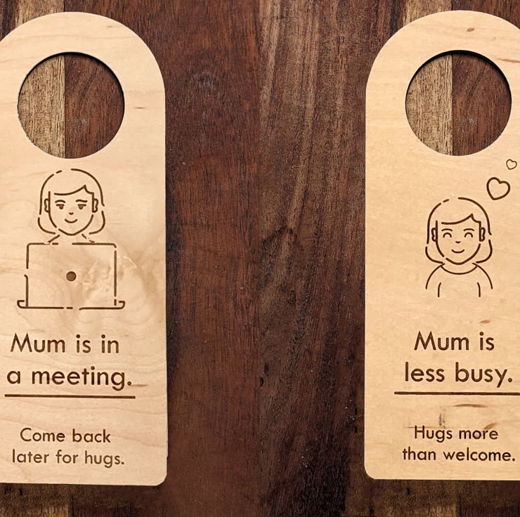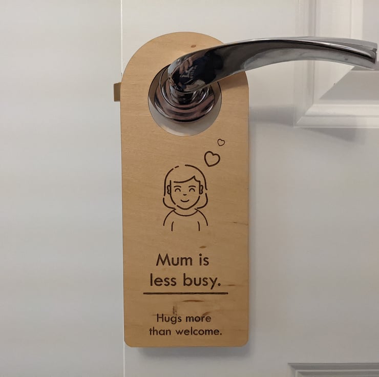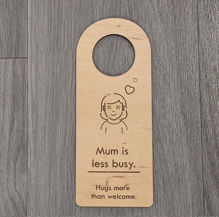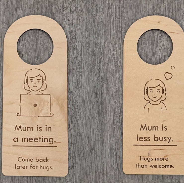 This article is a quality-finished, laser engraved do-not-disturb door hanger. The hanger is 2-sided and show s a do-not-enter message (Mum is on a meeting) on one side and a welcome-to-enter (Mum is at work) message on the other side.