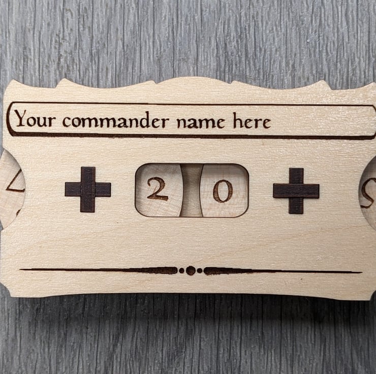 Please select the custom text you want on the life counter by adding your text desired on the personalization box. You can put your commander name or anything you like. If you are not sure what text you want you can simply write: Life counter or Hit counter.