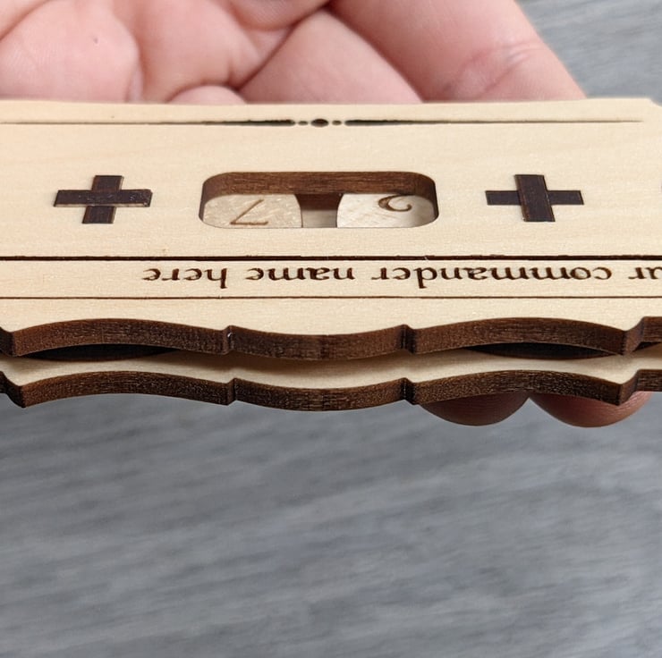 This article is a quality-finished, laser engraved Magic: The Gathering inspired (or any CCG) life counters for when you are playing. The hit point counters have two number wheels that include from 0 to 9 numbers on each one. You can rotate the wheels during the game so you can track your life easily.