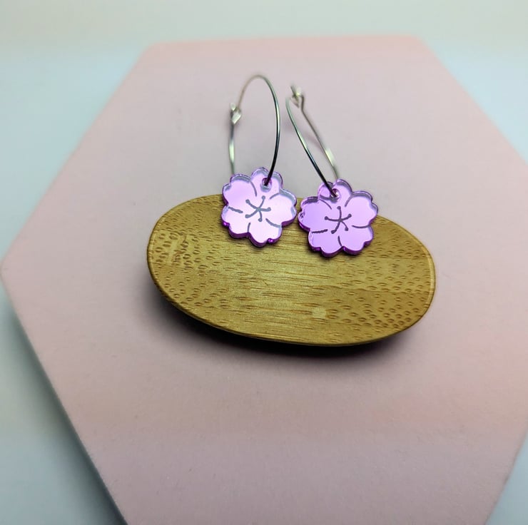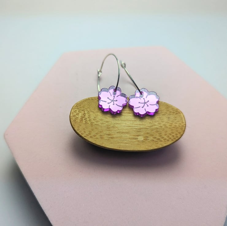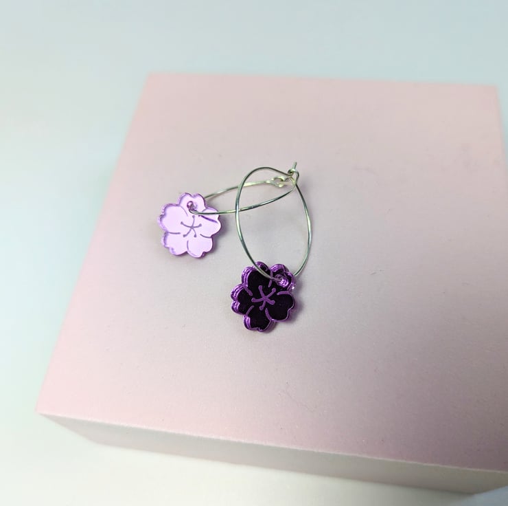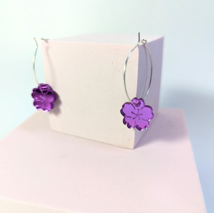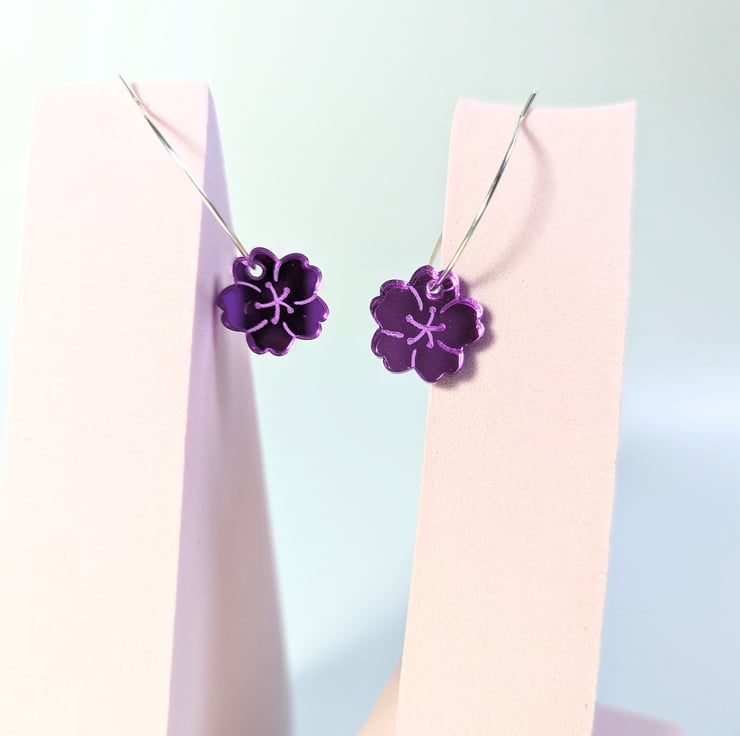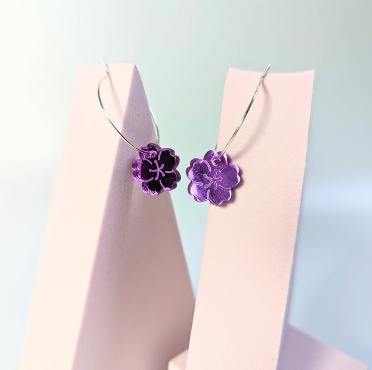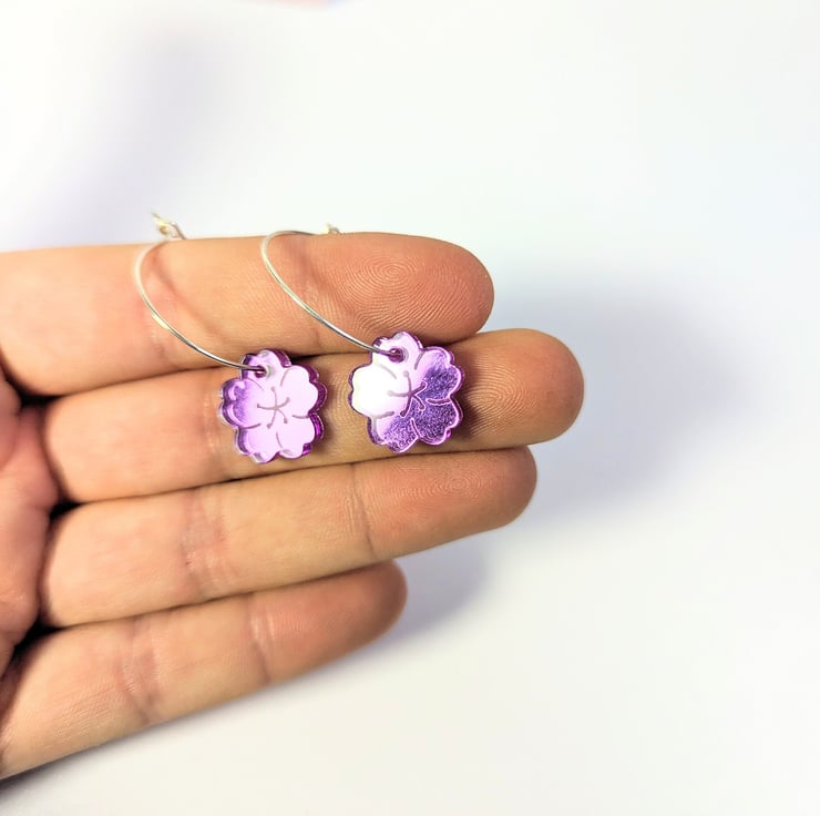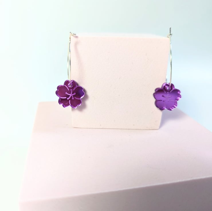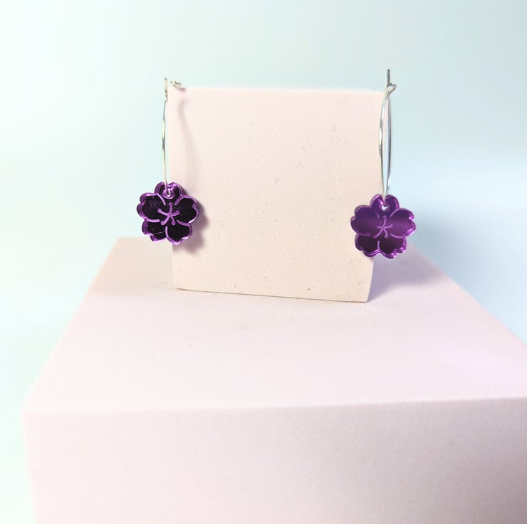 This article is a quality-finished, laser engraved acrylic cherry blossom earrings in mirror purple acrylic. The hoop its sterling silver so that your ears don't go green. The earrings includes a branded jewellery box made with FSC certified product. Please choose the size of the hoops (all images are showing the bigger hoop). You can choose between 2.5 cm 0.98 inches circle or 1.5 cm 0.59 inches circle.