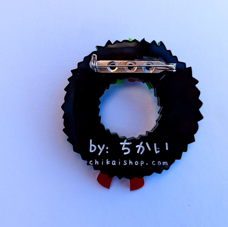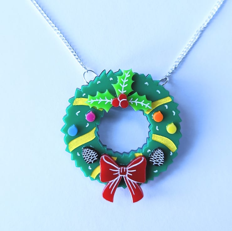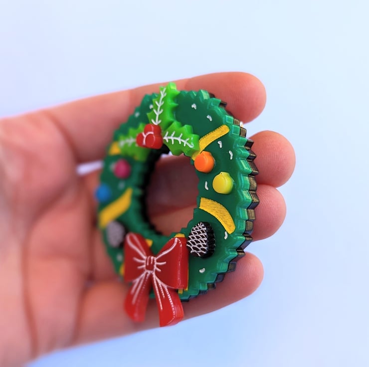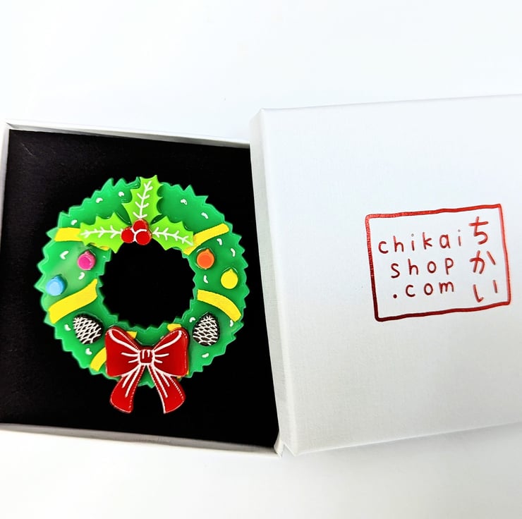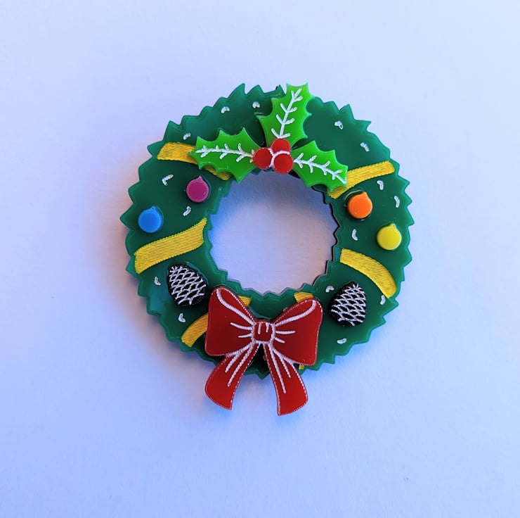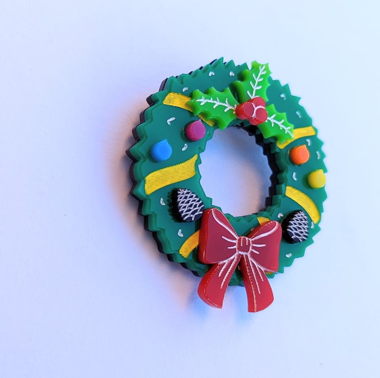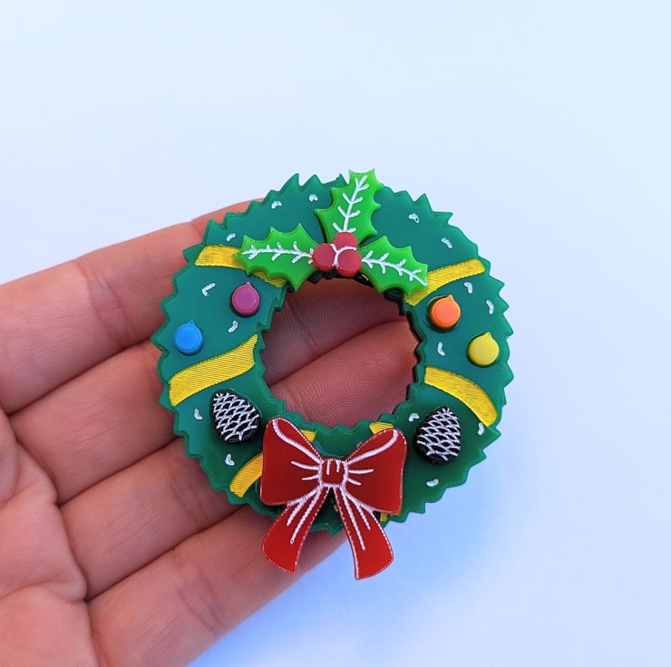 Christmas wreath brooch is made with different colour acrylic, brooch on the back and hand painted details, it is based on my own drawing. Each piece includes a branded jewellery box made with FSC certified product.