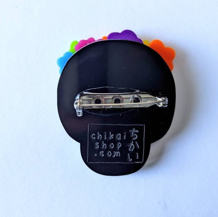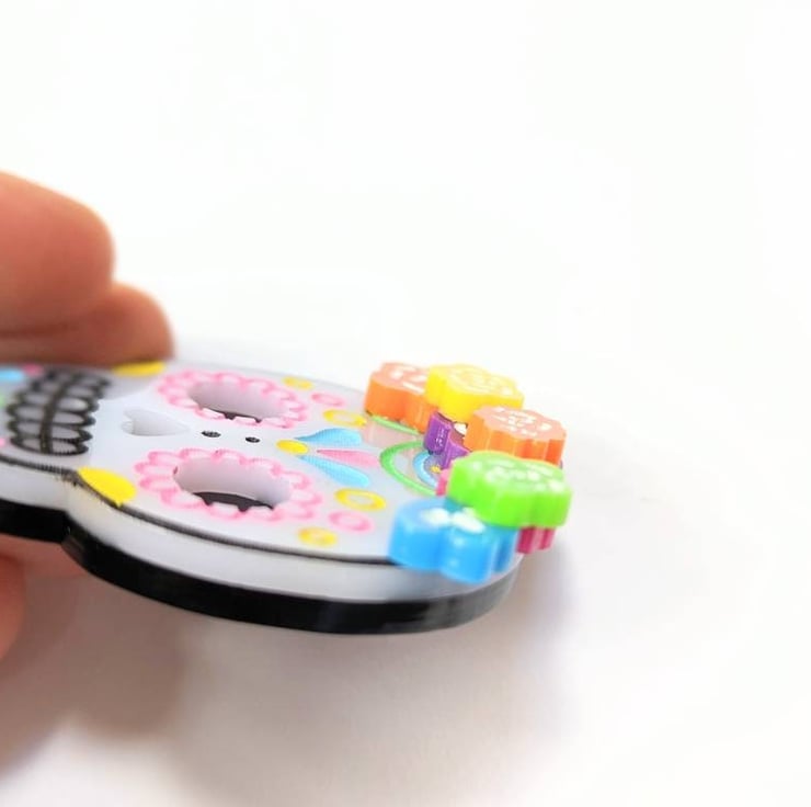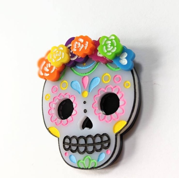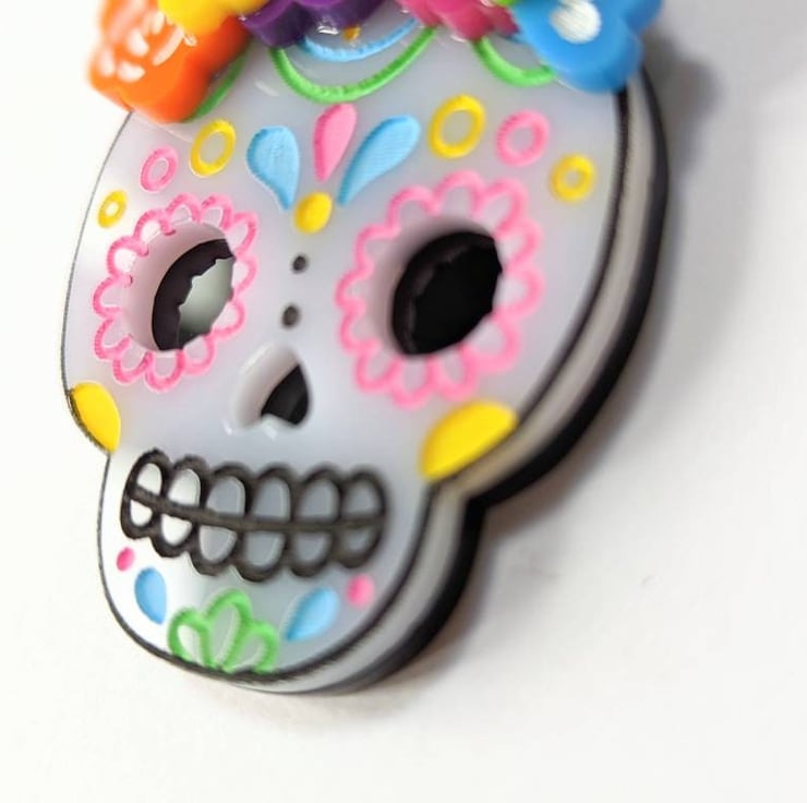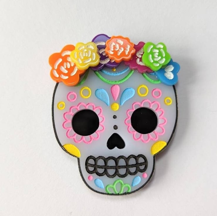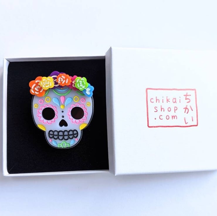 Catrina brooch is made with different colour acrylic, brooch on the back and hand painted skull details. Each piece includes a branded jewellery box made with FSC certified product.