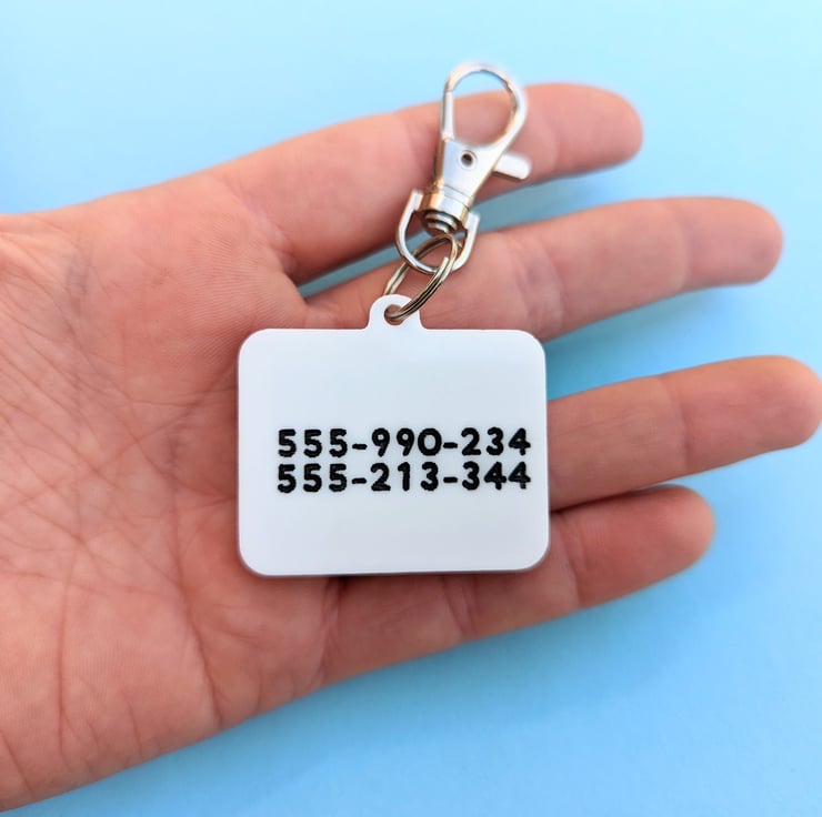 This article is made to order. You can choose the name or words on the front and all the info you want on the back. I can put telephone numbers but as well letters if you want to include an address or even some information. There is plenty of space to write. It includes the lobster clasp.