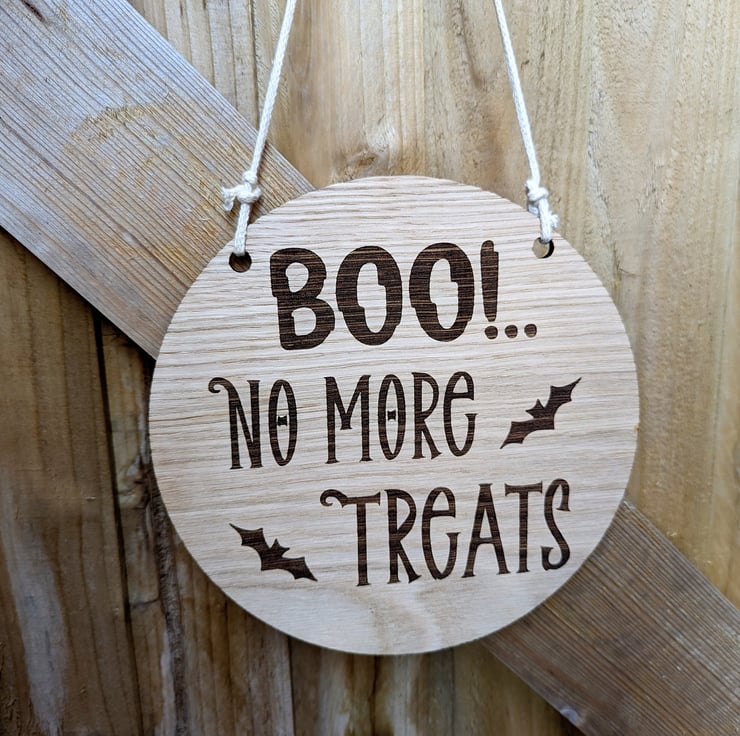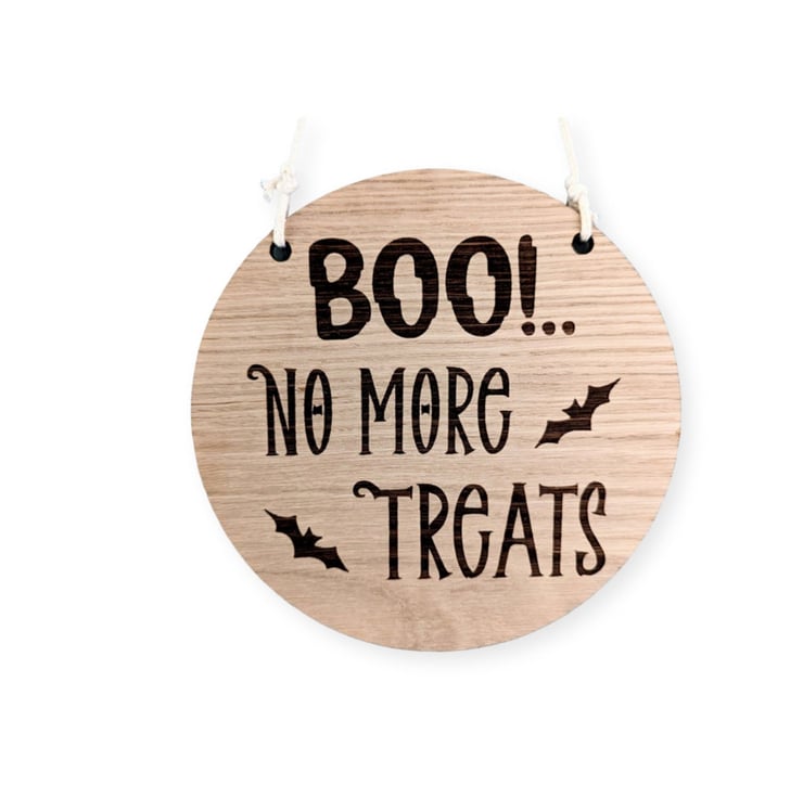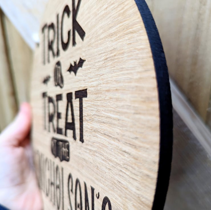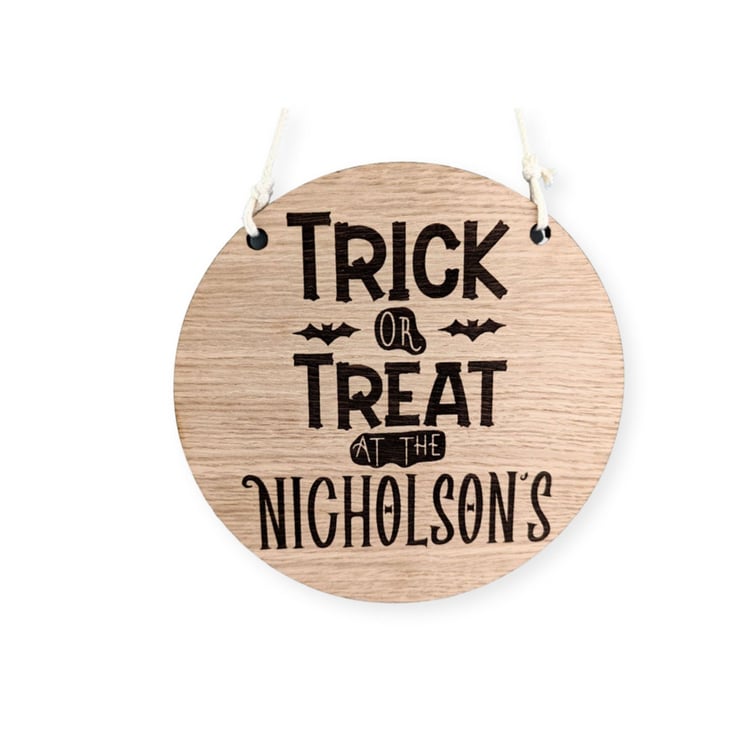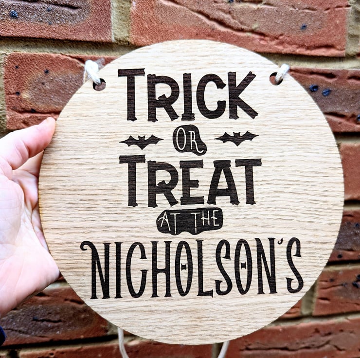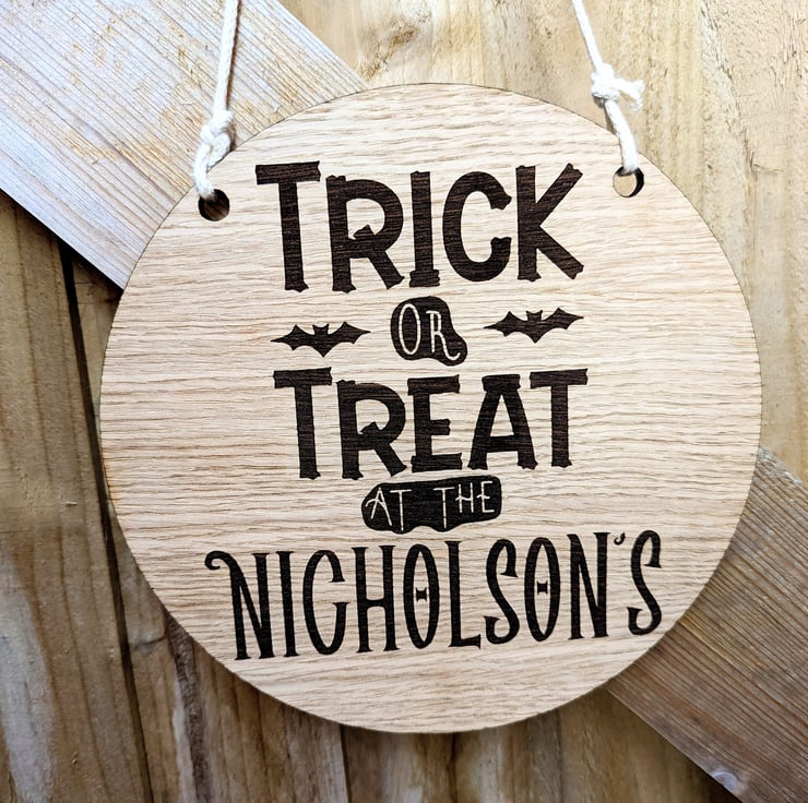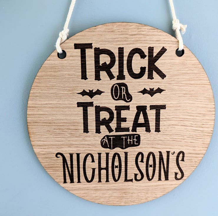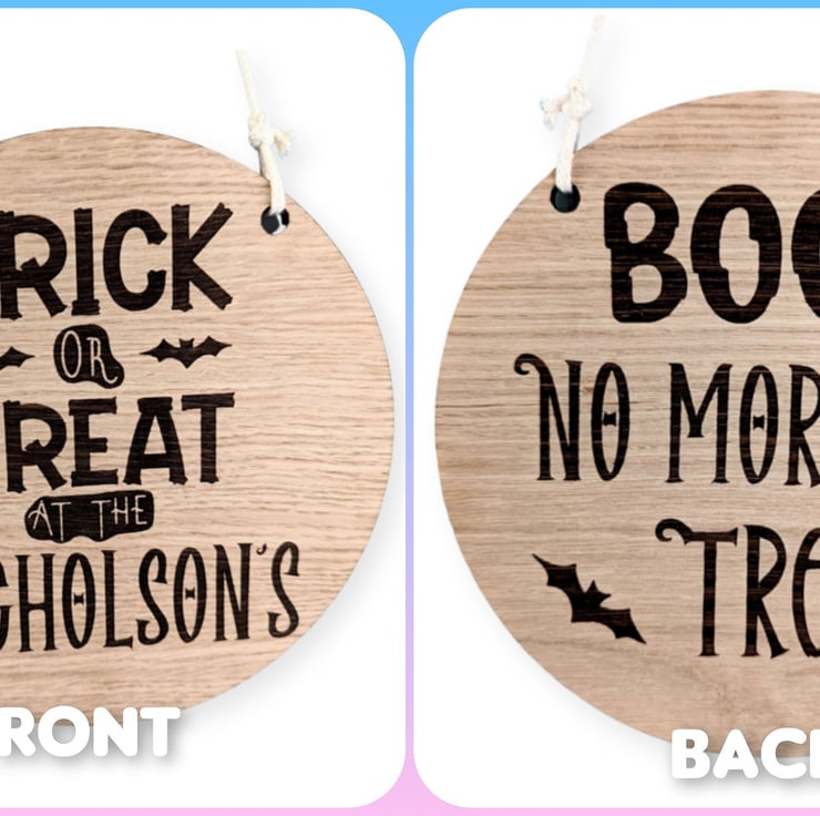 This article is a quality-finished, laser engraved door hanger for your home. The hanger is 2-sided and show s 'Trick or treat' message with your custom family name on one side and a 'No more treats' message on the other side.