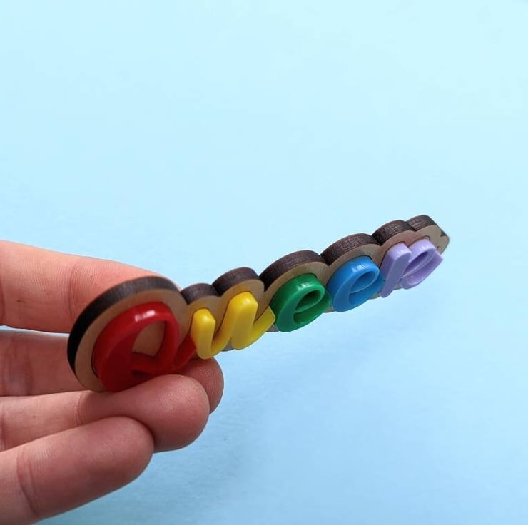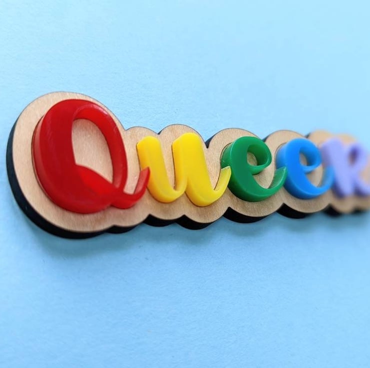 This article is a quality-finished, laser cut pin brooch with a rainbow letters that reads "Queer". The back of the badge features a brooch glued with a special super strong glue.