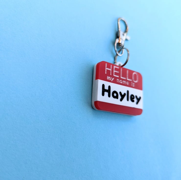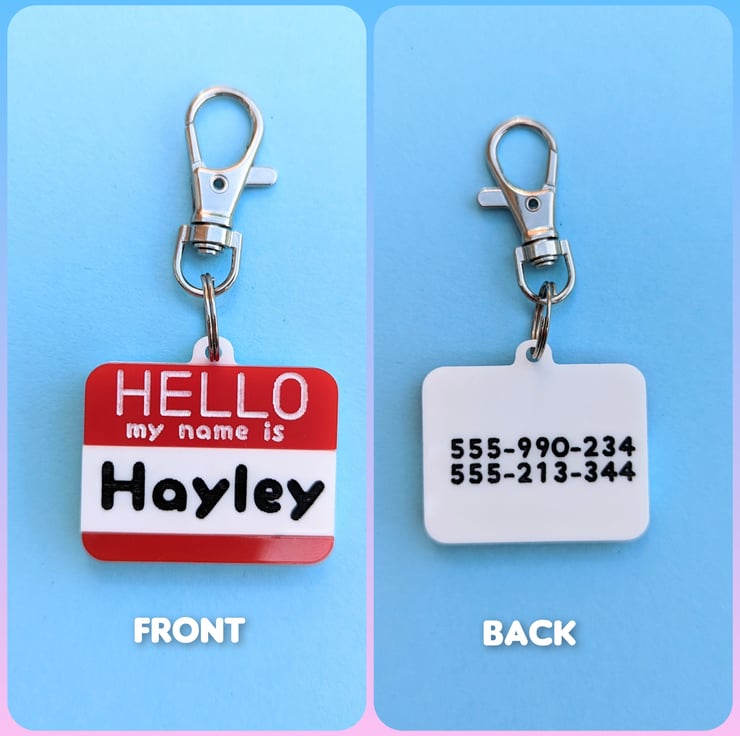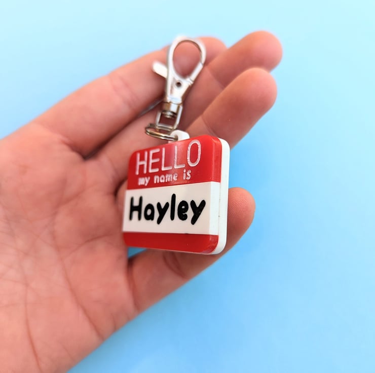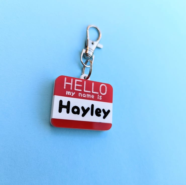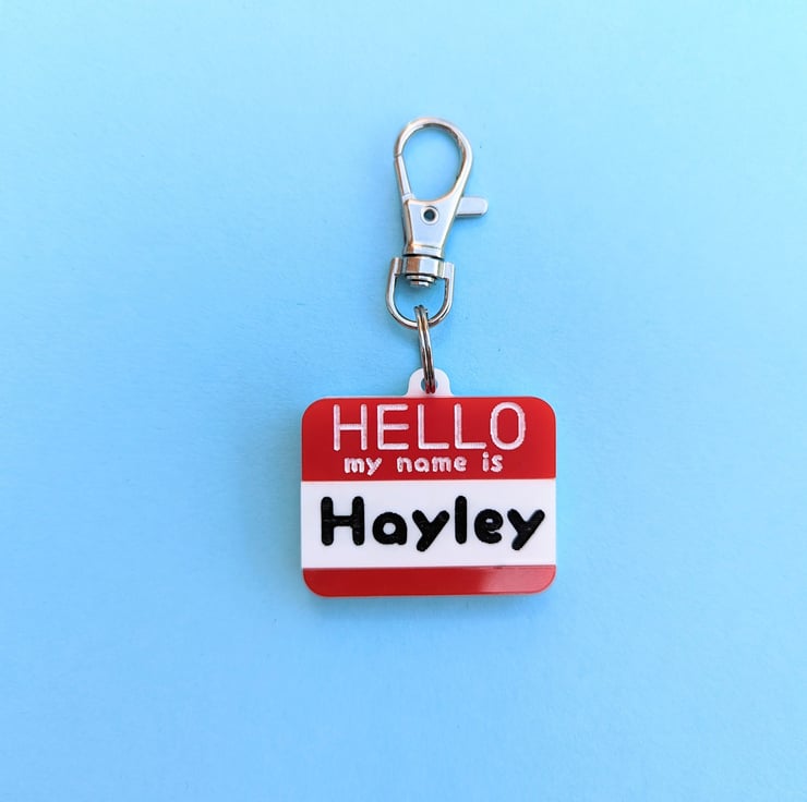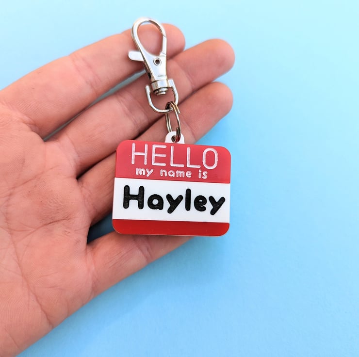 This article is a quality-finished, laser engraved acrylic Tag inspired on the "Hello my name is..." stickers. It is designed as the traditional red colour stickers but if you want to change the colours there is no problem about that. Just send me a message before buying so we can discuss the options. I have plenty of acrylic colours available to choose. I also can change the paint colours for the letters.