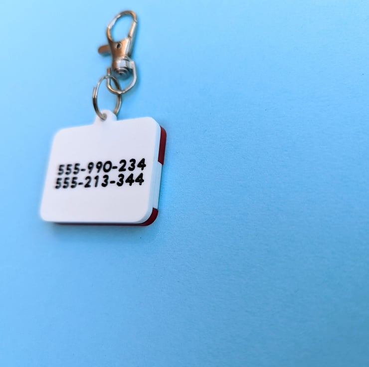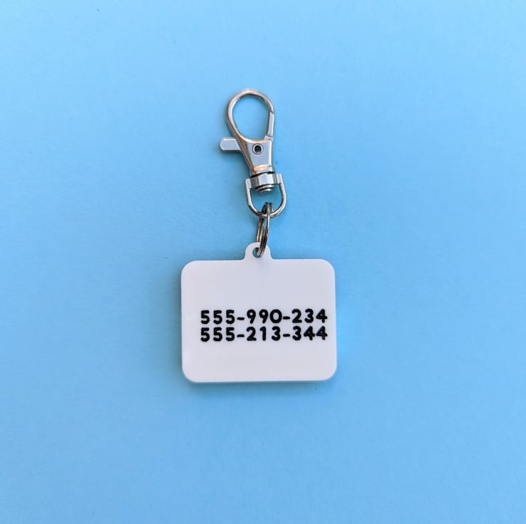This article is made to order. You can choose the name or words on the front and all the info you want on the back. I can put telephone numbers but as well letters if you want to include an address or even some information. There is plenty of space to write. It includes the lobster clasp.