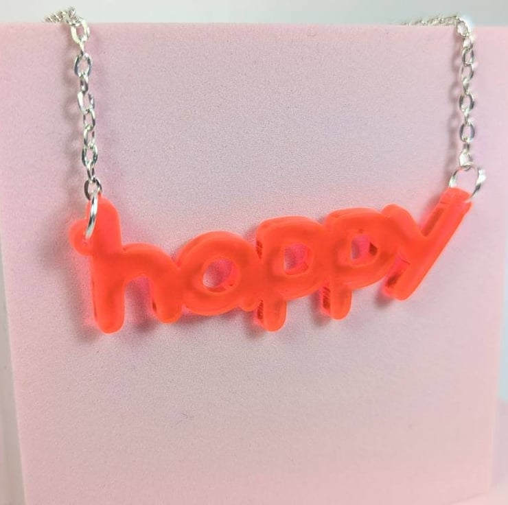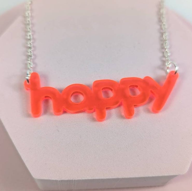 Happy necklace made with neon pink translucent acrylic and silver plated chain with silver plated rings and necklace clasp. The necklace from end to end, including the acrylic measures 55cm long (21.6 inches). If you want to make it shorter you can slightly adjust with the extension chain included at the end of the necklace. If you want a bit longer, just drop me a line and I'll make you longer for free, because it's made to order and I cut and make the chains myself.