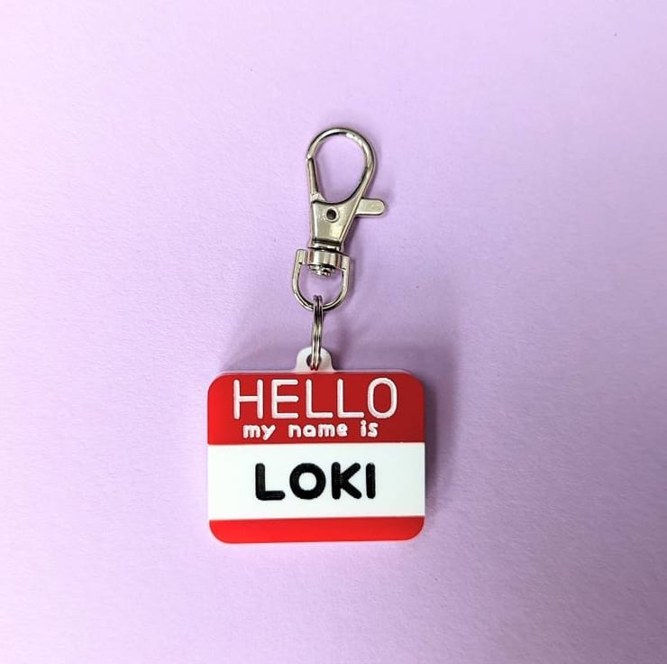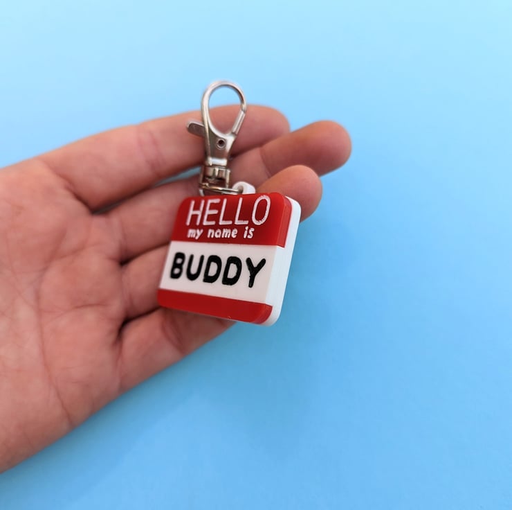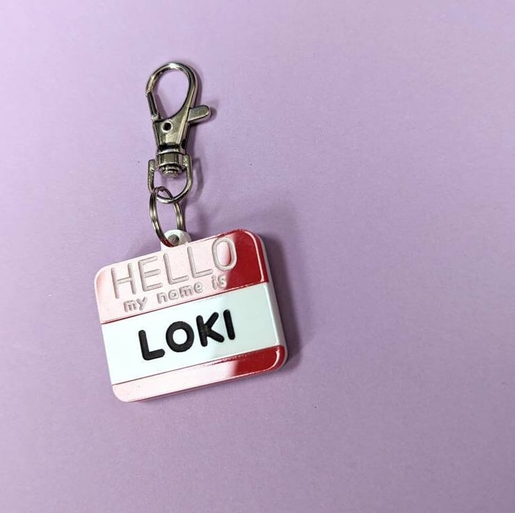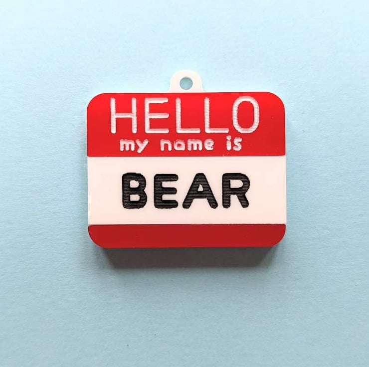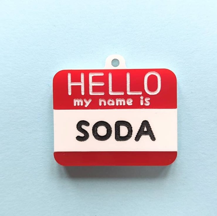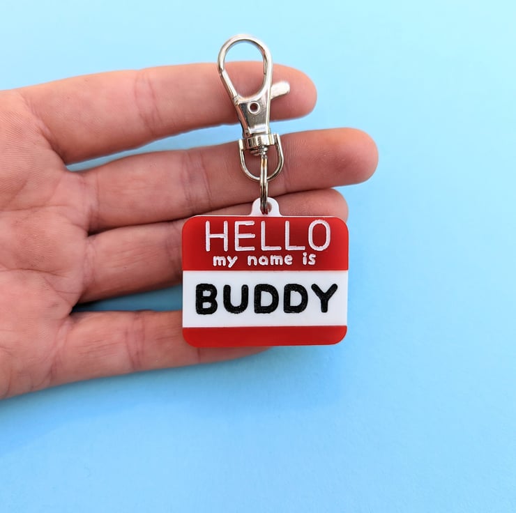 This article is a quality-finished, laser engraved acrylic Pet ID Tag inspired on the "Hello my name is..." stickers. It is designed as the traditional red colour stickers but if you want to change the colours there is no problem about that. Just send me a message before buying so we can discuss the options. I have plenty of acrylic colours available to choose. I also can change the paint colours for the letters.