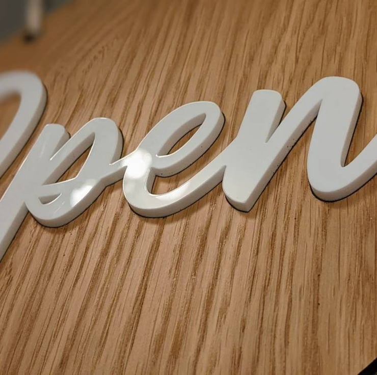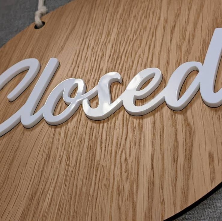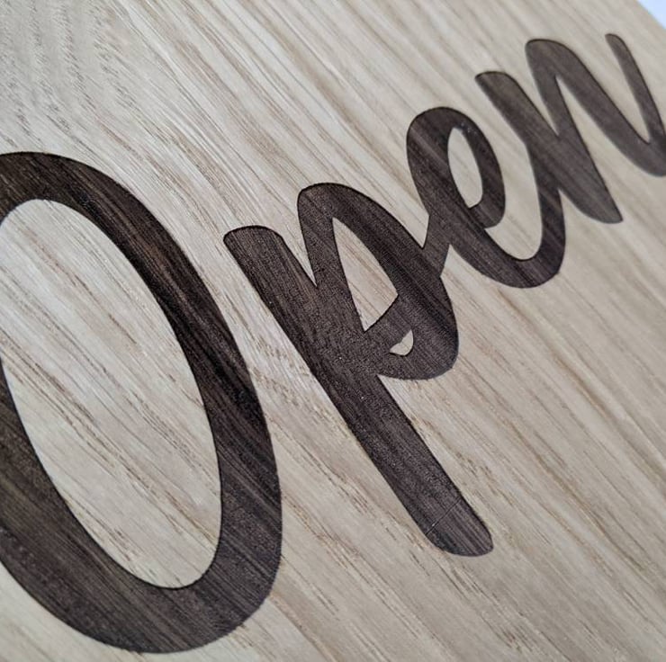 You can buy the article with the letters engraved only into the wood or you can buy the article with the letters that says Open and Closed in 3D acrylic (raised). This item should be used indoor only.
