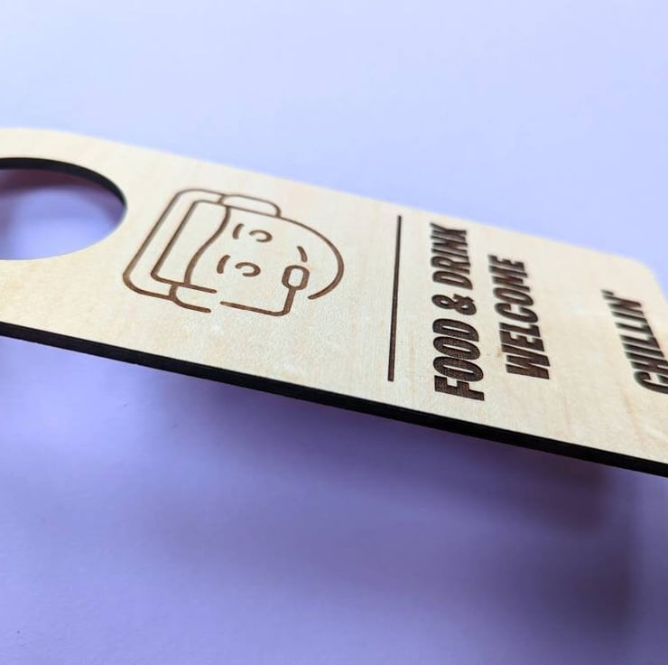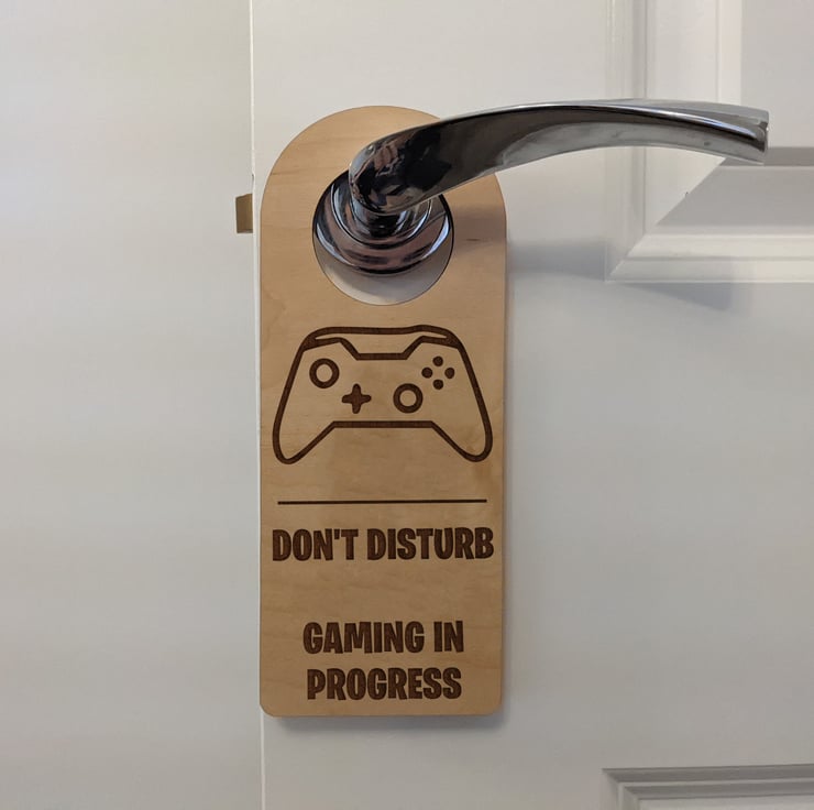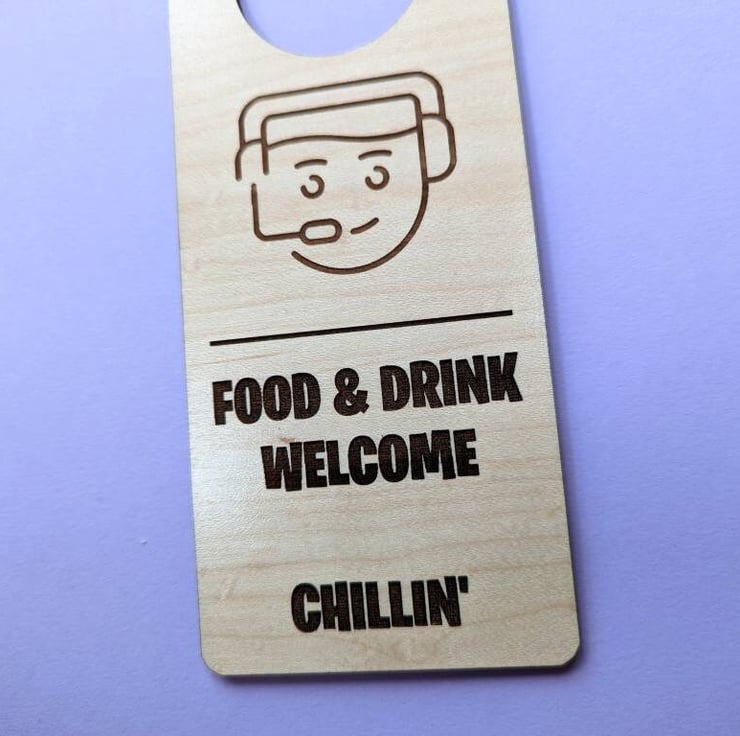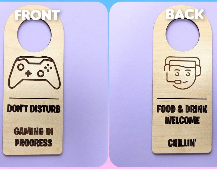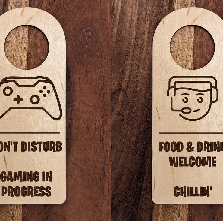 This article is a quality-finished, laser engraved do-not-disturb door hanger. The hanger is 2-sided and shows a do-not-enter message (Gaming in progress) on one side and a welcome-to-enter (Food and drink welcome) message on the other side.