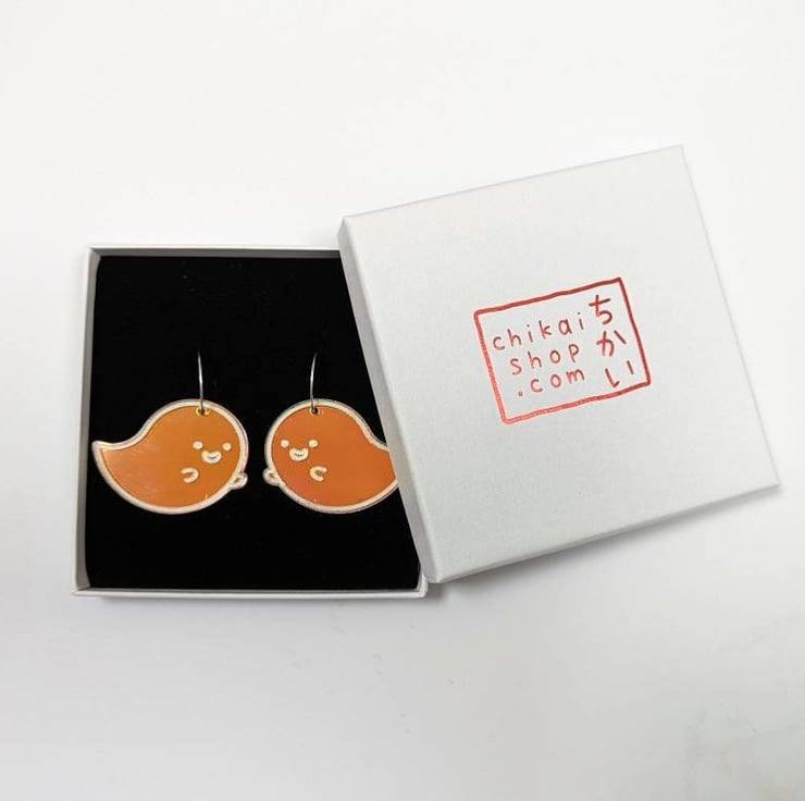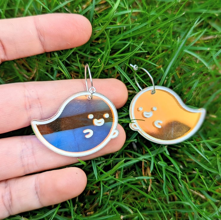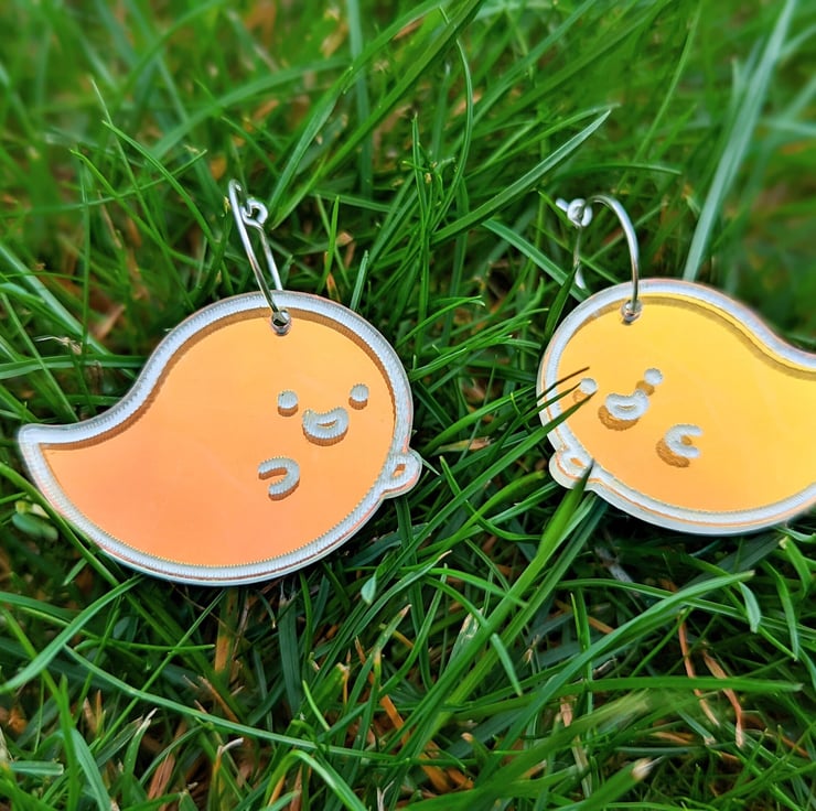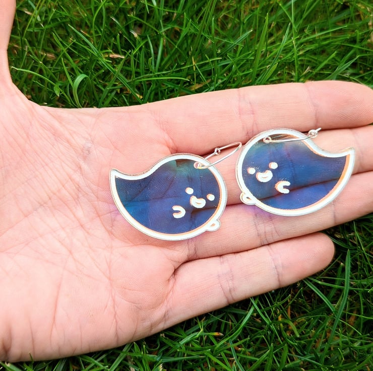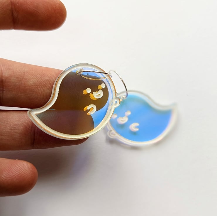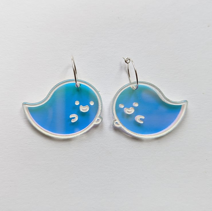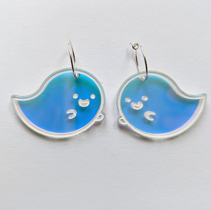 This article is a quality-finished, laser engraved acrylic Ghost earrings in translucent iridescent. The hoop its sterling silver so that your ears don't go green and you can choose the diameter as well. The product images with the ghost are with the small hoop. Each piece includes a branded jewellery box made with FSC certified product.