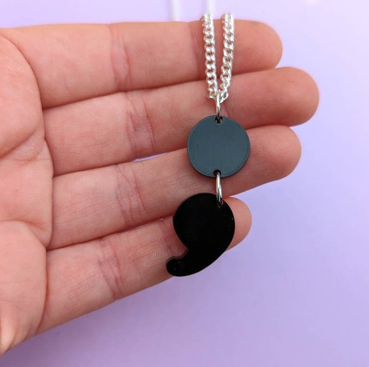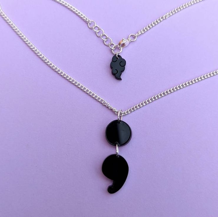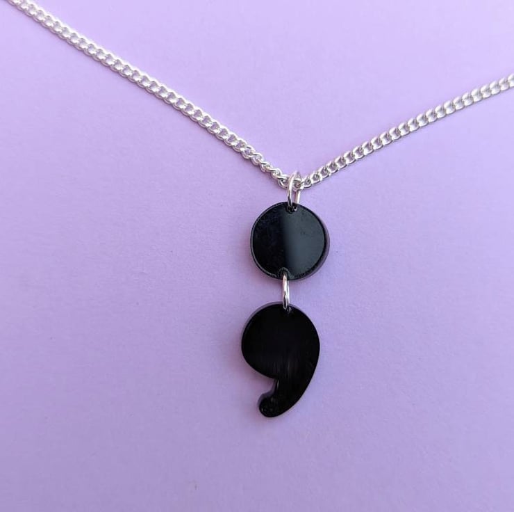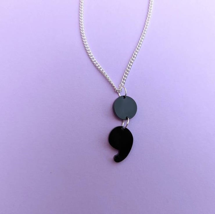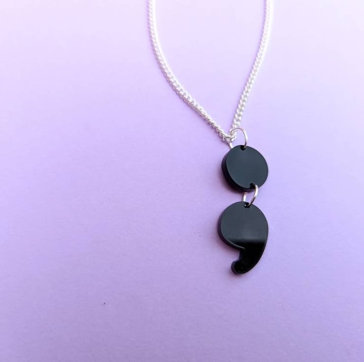 Semicolon necklace made with black acrylic and silver plated chain with silver plated rings and necklace clasp. The necklace from end to end measures 55cm long (21.6 inches). If you want to make it shorter you can slightly adjust with the extension chain included at the end of the necklace. If you want a bit longer, just drop me a line and I'll make you longer for free, because it's made to order and I cut and make the chains myself.