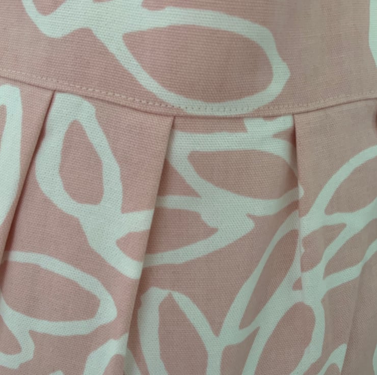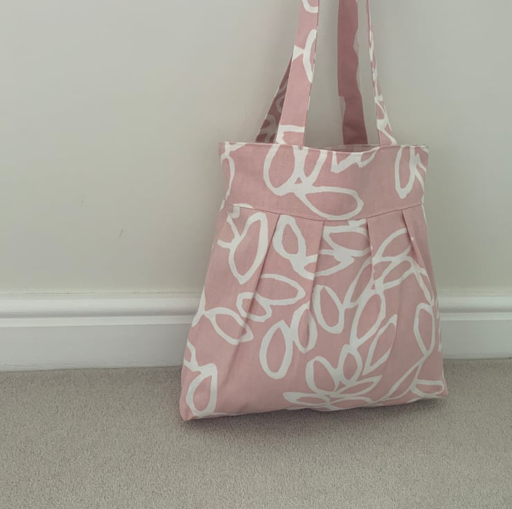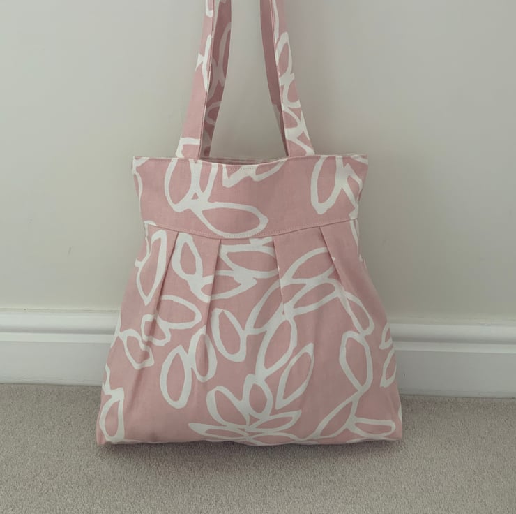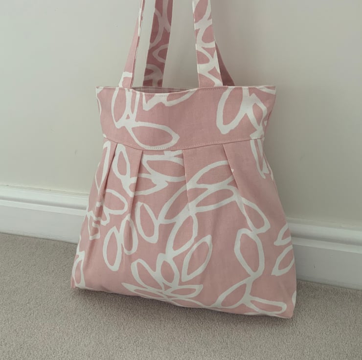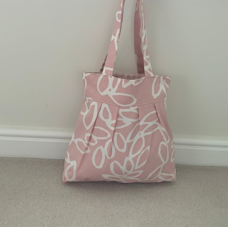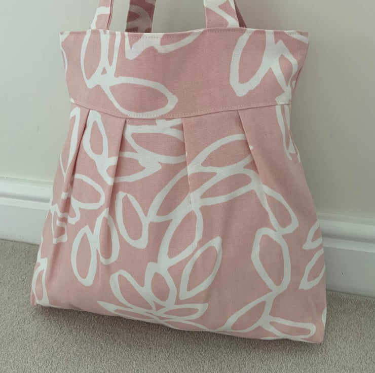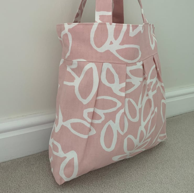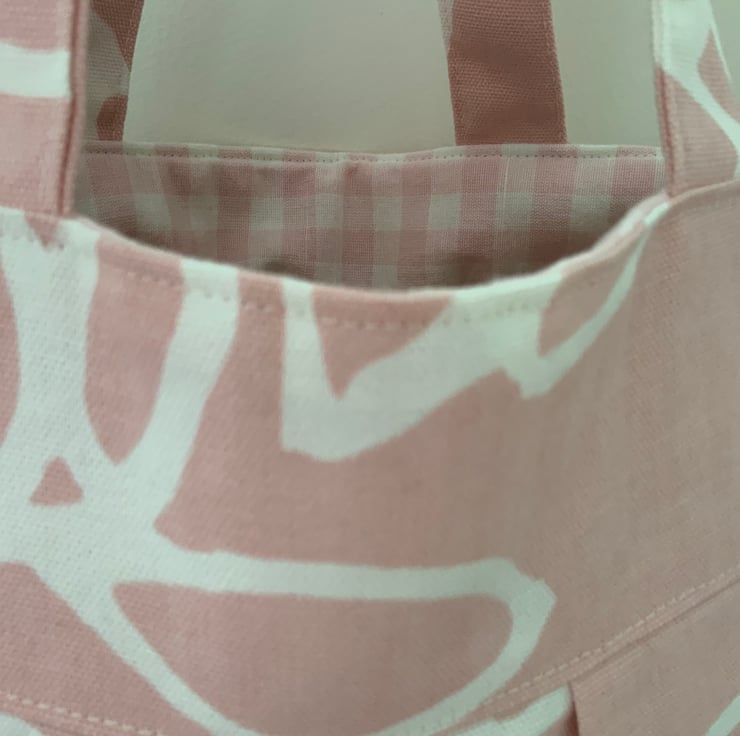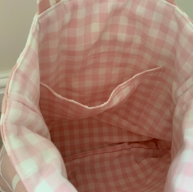 Beautiful pale pink pleated tote bag, lined with pink gingham and has a layer of interlining in between to give it structure and a soft feel. Internally, it has a small slip pocket. The square bottom gives the bag extra depth.