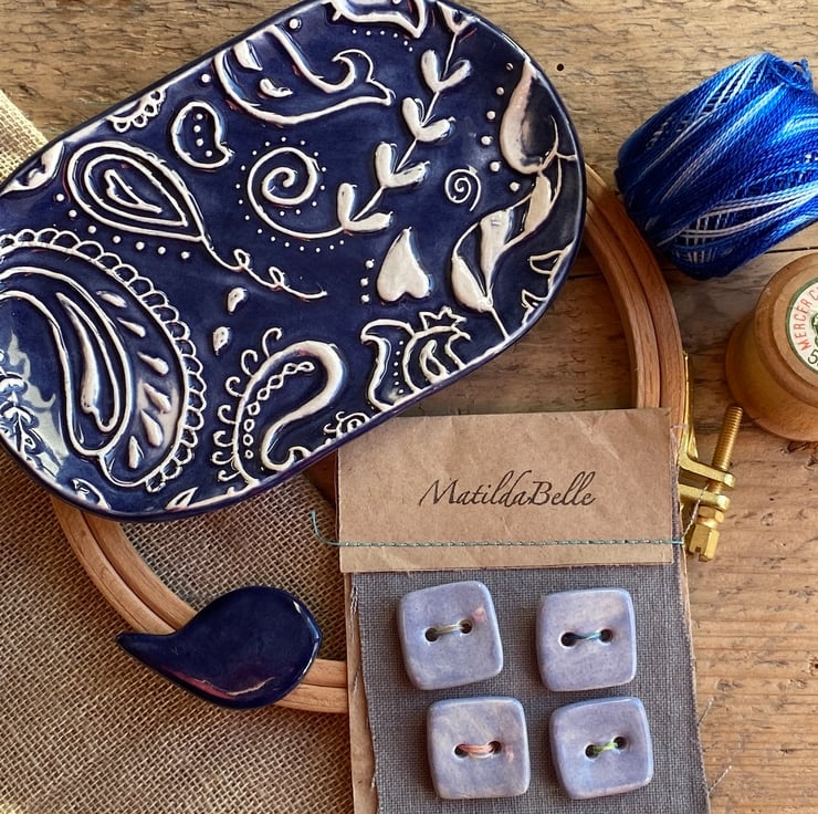 Inside, you'll find a beautifully crafted oval Ceramic tray perfect for keeping scissors safe. Measuring 14 cm x 9cm made from earthenware clay and imprinted with an original MatildaBelle paisley carving.