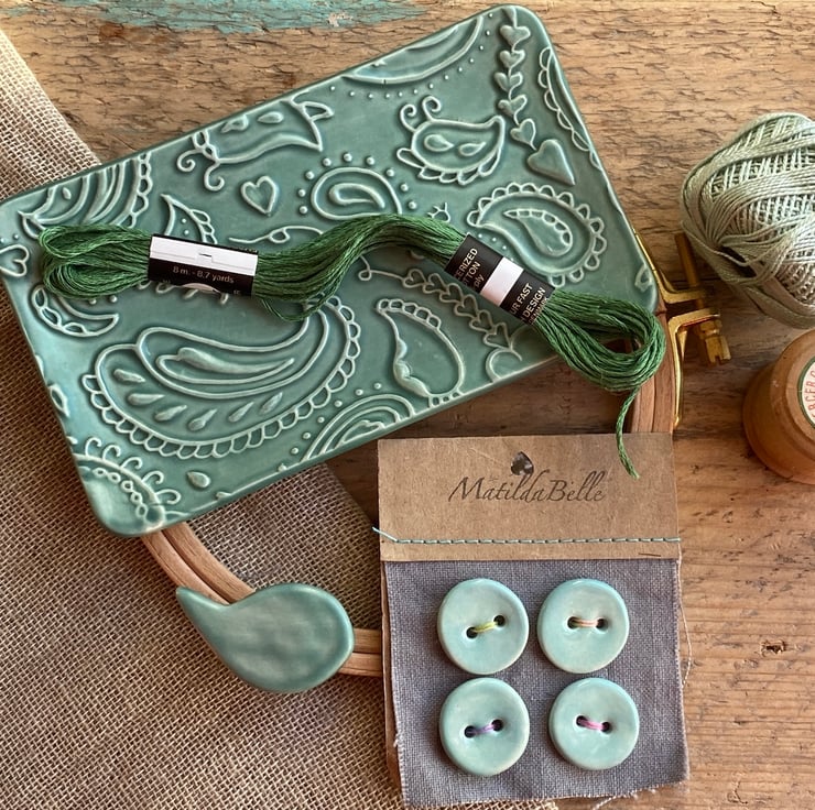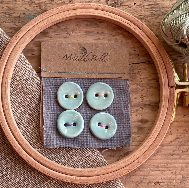 A beautiful set of four handmade square pottery buttons are also included. These lovely ceramic buttons are glazed in a pastel blue/green and measure 2 x 2 cm.