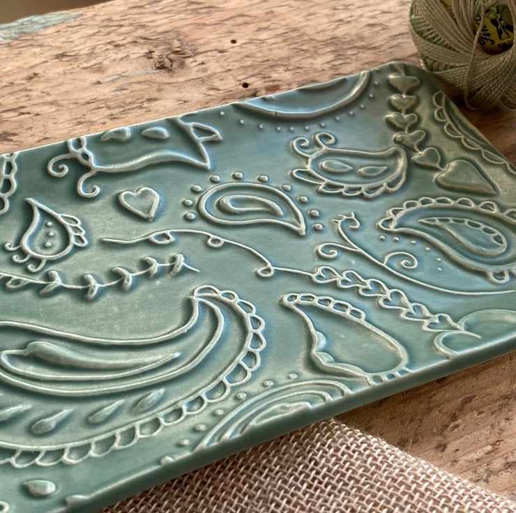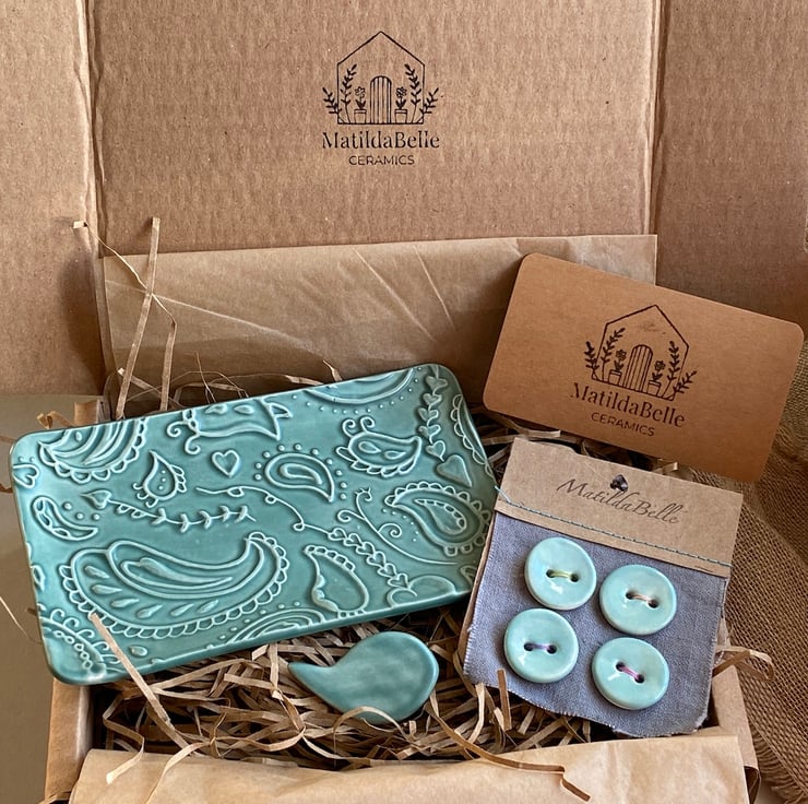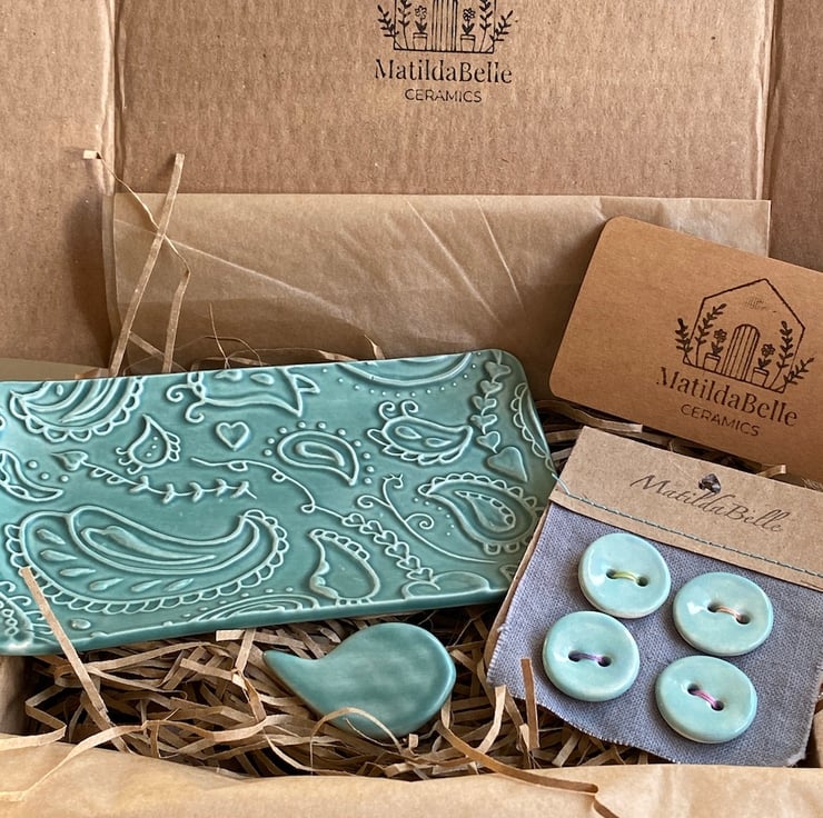 Inside, you'll find a beautifully crafted oval Ceramic tray perfect for keeping scissors safe. Measuring 14 cm x 9cm made from earthenware clay and imprinted with an original MatildaBelle paisley carving.