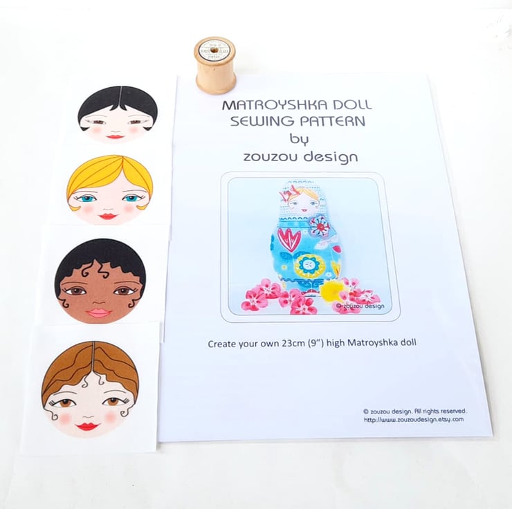 If you sew and would like to make a doll similar to this one we also sell a PDF Matryoshka doll pattern and also a kit with paper sewing pattern and cloth doll faces (see last two images).