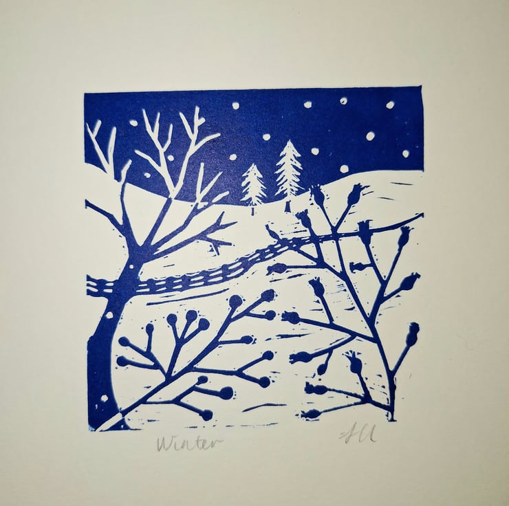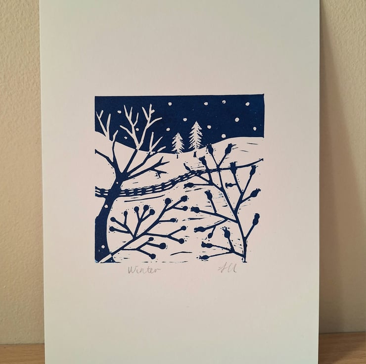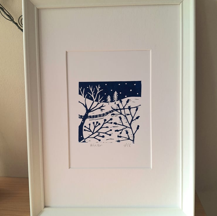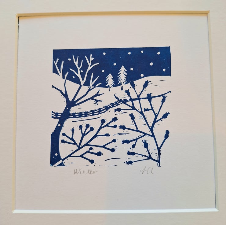 The ink used is Caligo Safewash ink and the linoprint is printed on Printmakers Snowdon paper, 300 gsm. Each print is titled 'Winter' and signed in pencil.