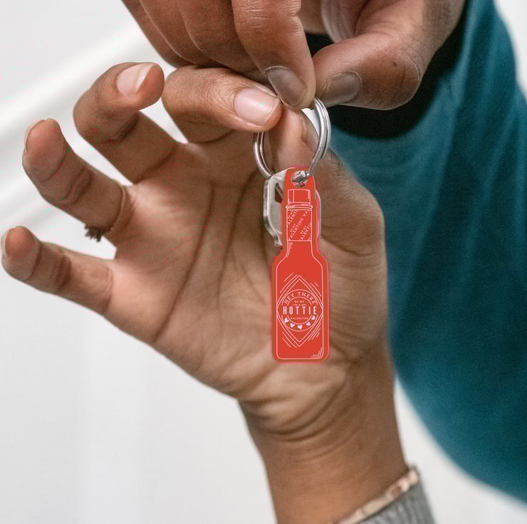 Spice up your Valentine's Day with our sizzling Hot Sauce Acrylic Keyring featuring the saucy quote "Hey there, Hottie!"