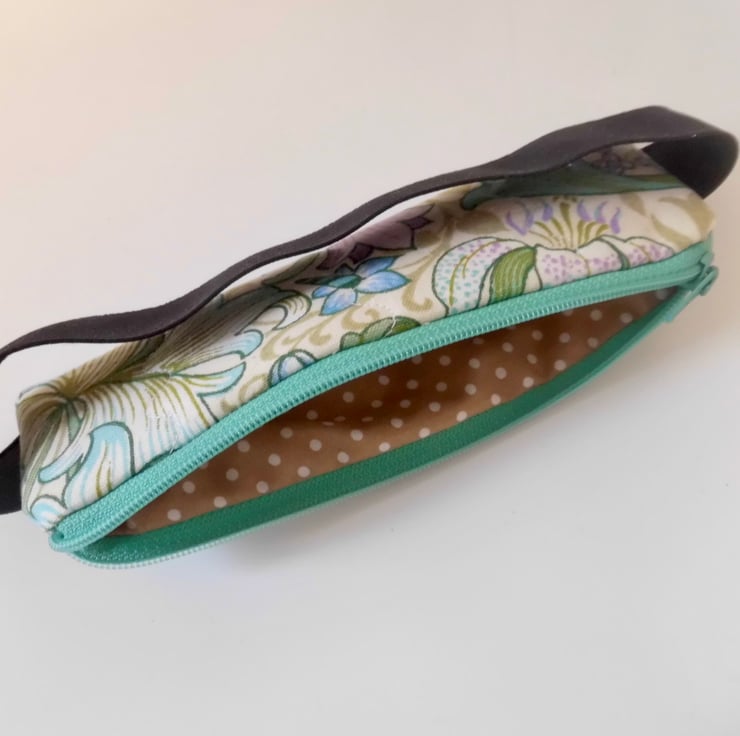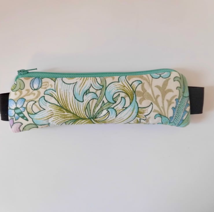 I made this pencil case in William Morris design fabric called Golden Lily in green and mauves. Medium Weight Cotton. I backed this fabric with fusible quilters wadding and then machined three rows each side in wave stitch to achieve a lightly quilted effect. Lined with a coffee coloured spotted cotton.