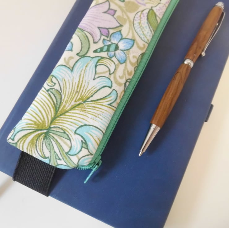 It has a green zip across the top. The elastic is black and 23mm wide. The pencil case measures about 17.5 cm x 5 cm and I have shown it here on the cover of a book 21cm tall and it fits perfectly, although because it's elastic it will fit a book perhaps a couple of centimetres bigger.