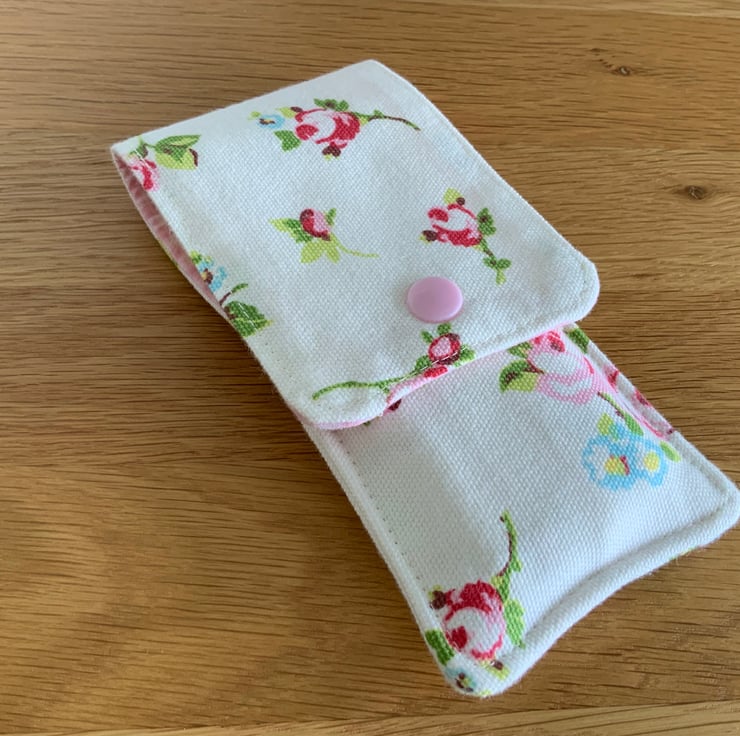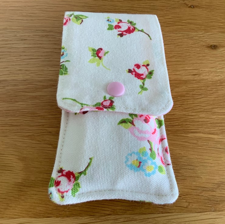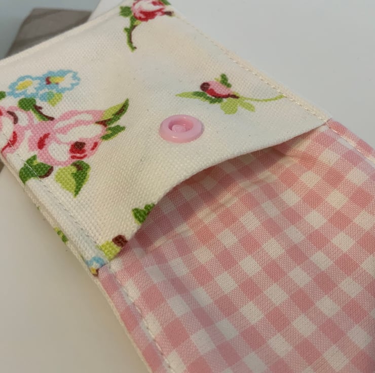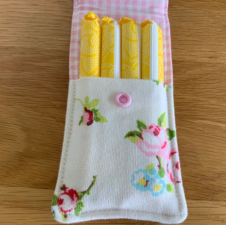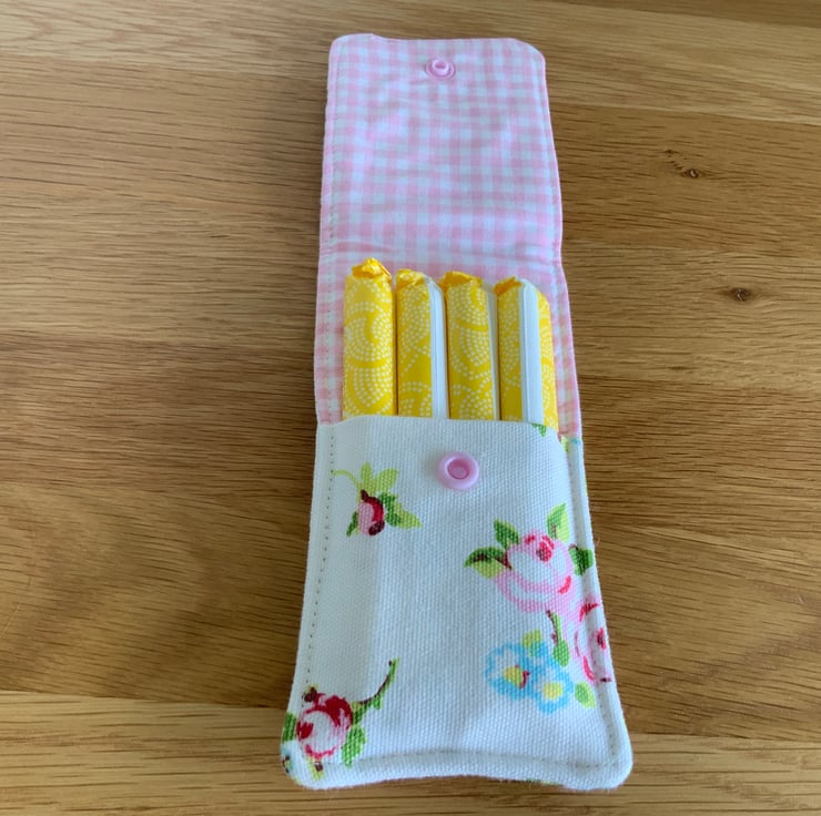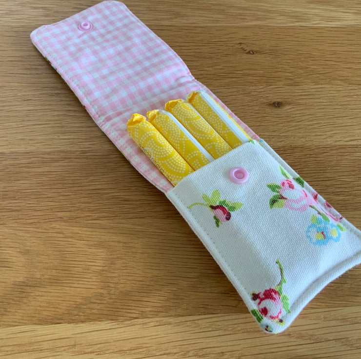 A beautiful little storage case to hold your personal feminine care products. A case which can be easily stored in your hand bag, school bag, beach bag, office drawer, car etc. Made from a pretty floral fabric on the exterior with a pink gingham lining and interlined to give a slightly padded feel. Finished with a plastic snap fastener internally to keep it secure.