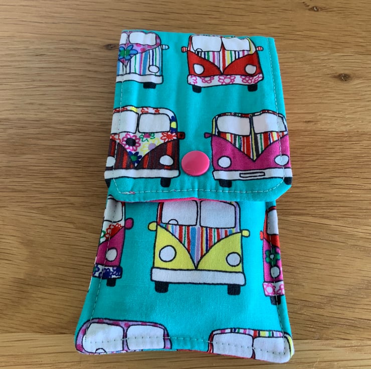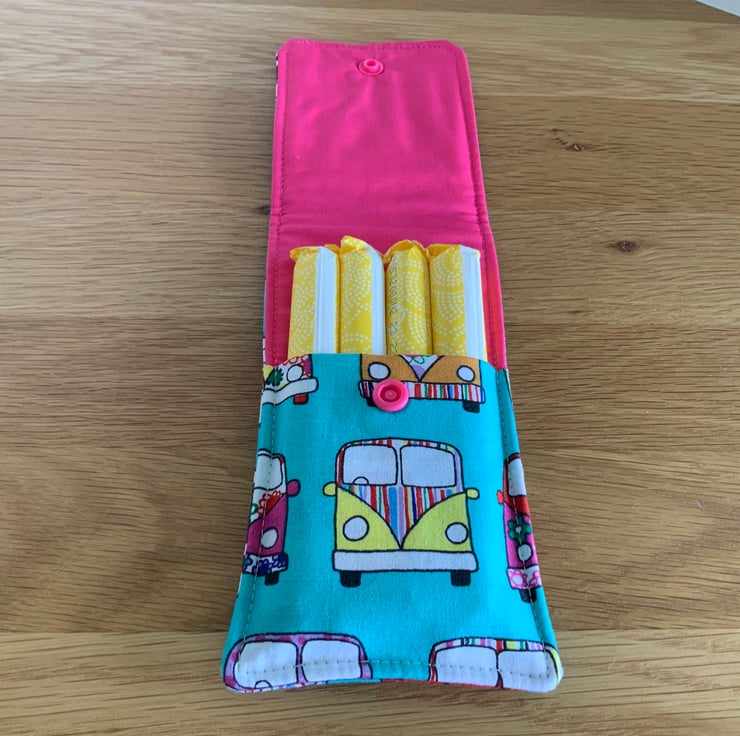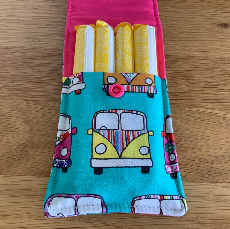 A beautiful little storage case to hold your personal feminine care products. A case which can be easily stored in your hand bag, school bag, beach bag, office drawer, car etc. Made from a campervan fabric on the exterior with a pink lining and interlined to give a slightly padded feel. Finished with a plastic snap fastener internally to keep it secure.