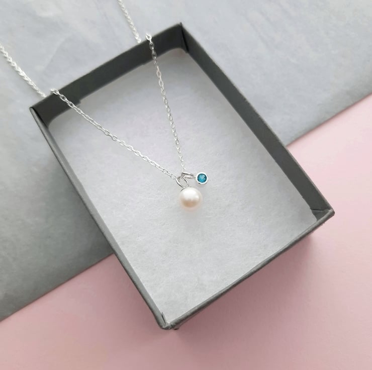 The pearl is a nice size, measuring at just under 7.5mm in diameter and comes on an 18 inch (45cm) Sterling silver trace chain. The handmade Sterling silver charm is set with a 3mm precision-cut topaz.