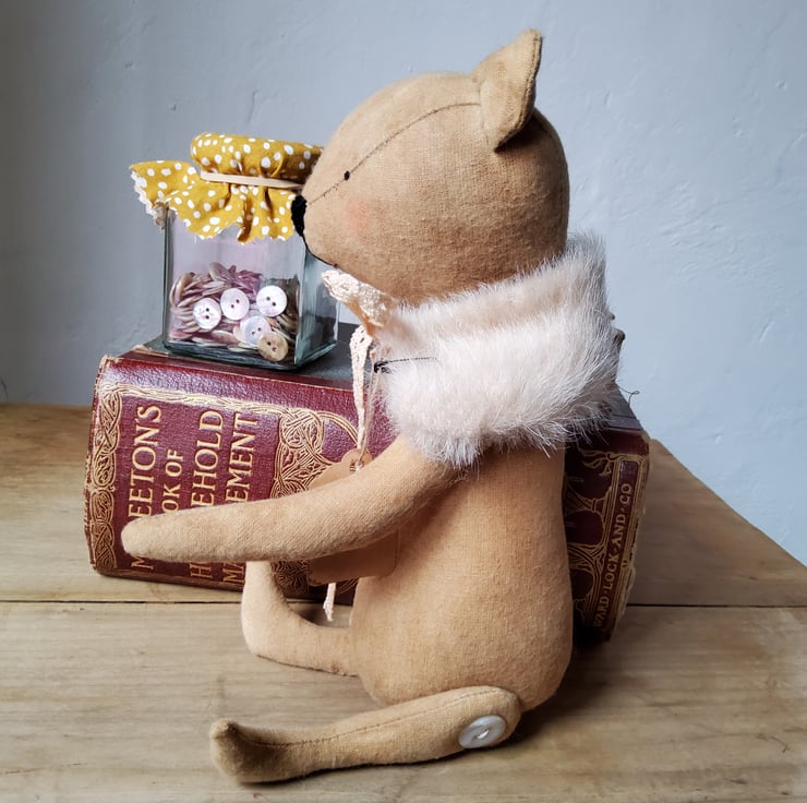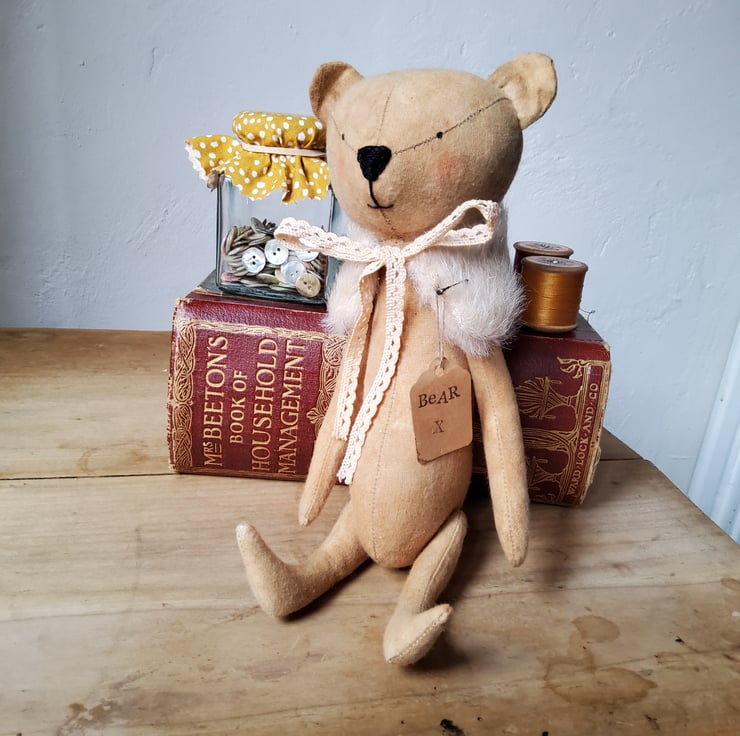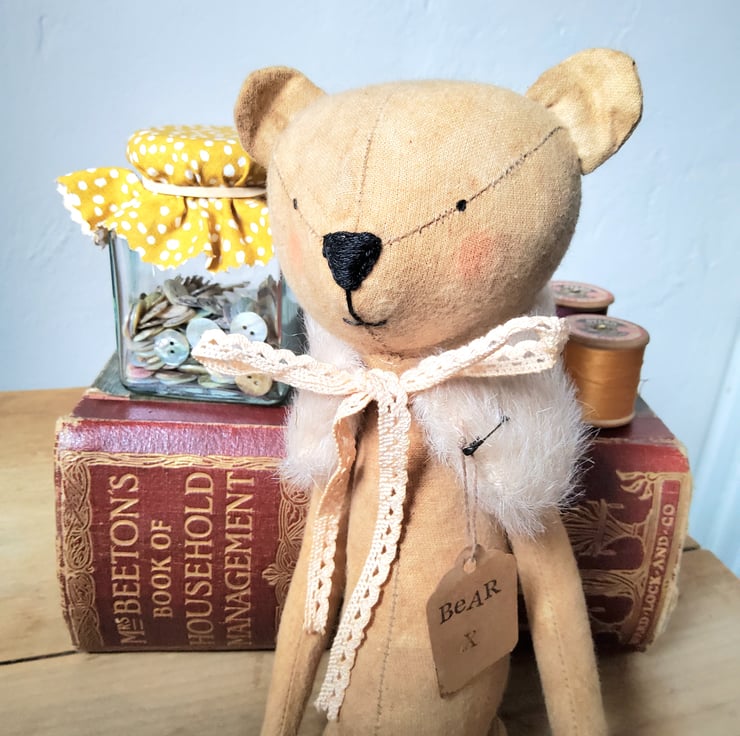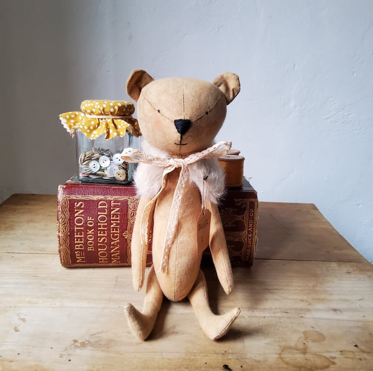 Bear is made from coffee and cinnamon dyed calico fabric with embroidered features and has painted eyes. The limbs have been jointed with old mother of pearl buttons. The wrap is made from mohair with vintage lace ties. Bear has also been stuffed with carded wool. Standing Bear is about 28 cms and is about 22cms sitting.