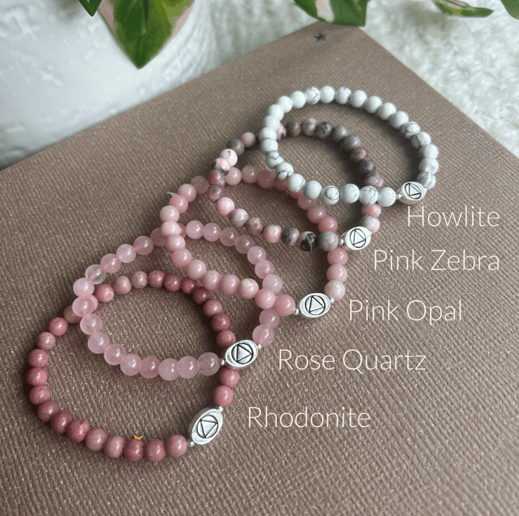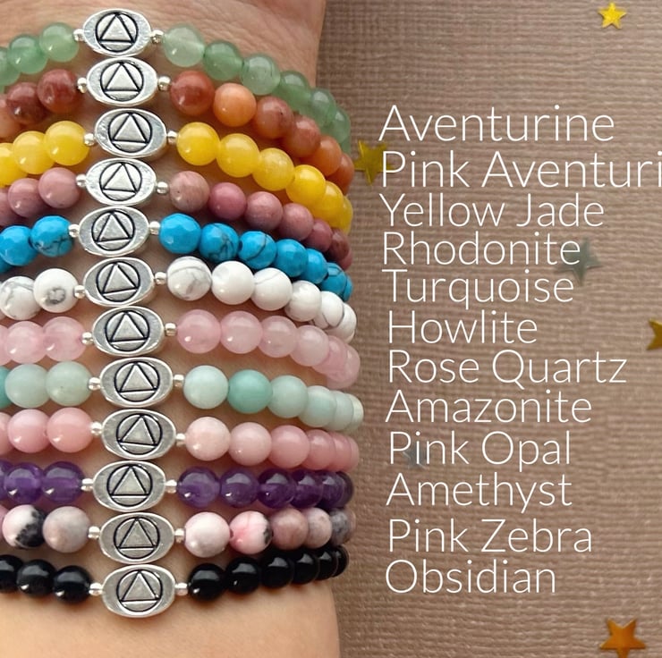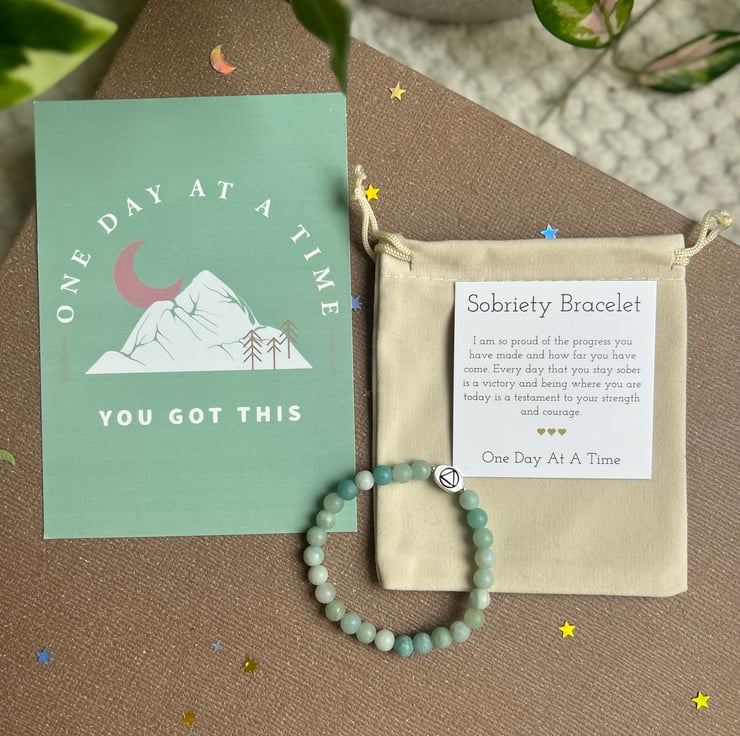Handmade Gemstone bracelet with a silver AA charm. Comes with a sobriety backing card I have designed in a protective pouch. Also has a One Day At A Time A6 encouragement card!