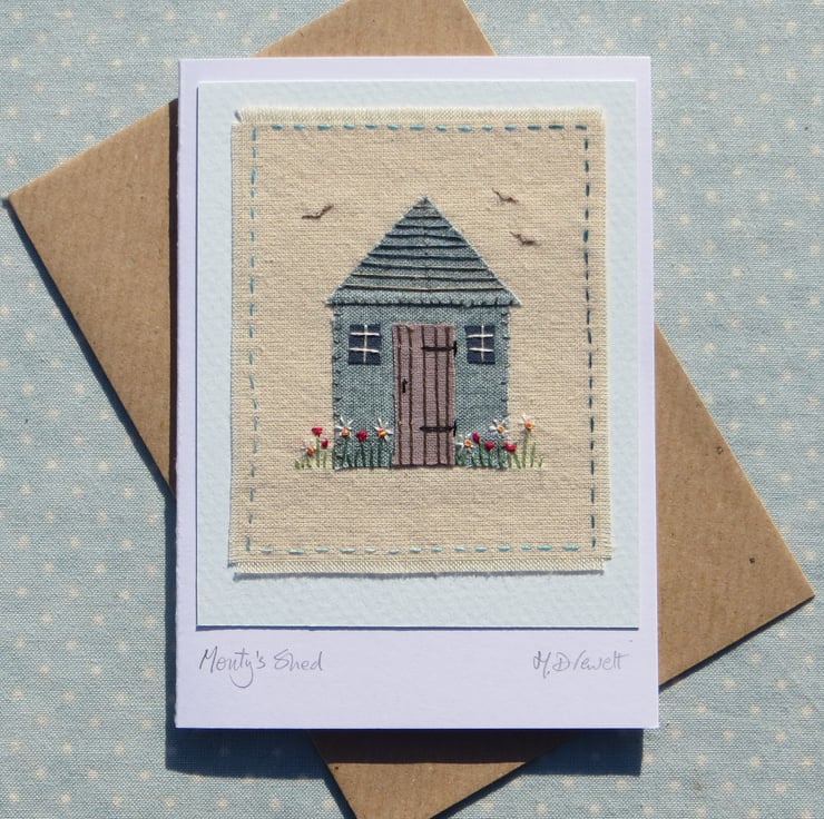 Whilst watching Gardeners' World, filmed in Monty Don's garden, I saw a little shed in the background, surrounded by flowers; I loved the shape and I decided to stitch it! (I hope Monty does not mind.) Here it is, entitled, of course 'Monty's Shed'.