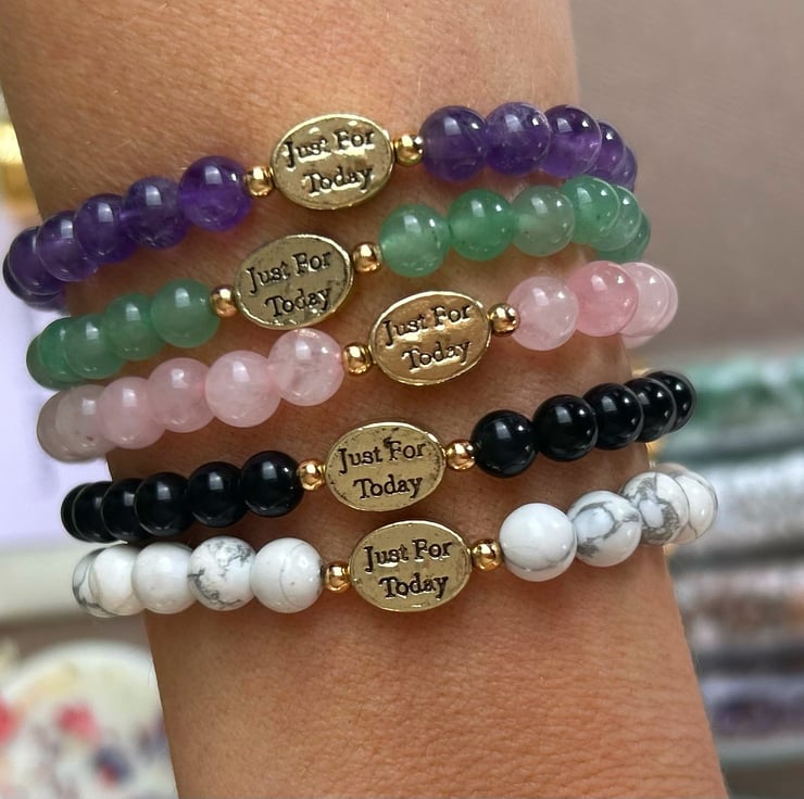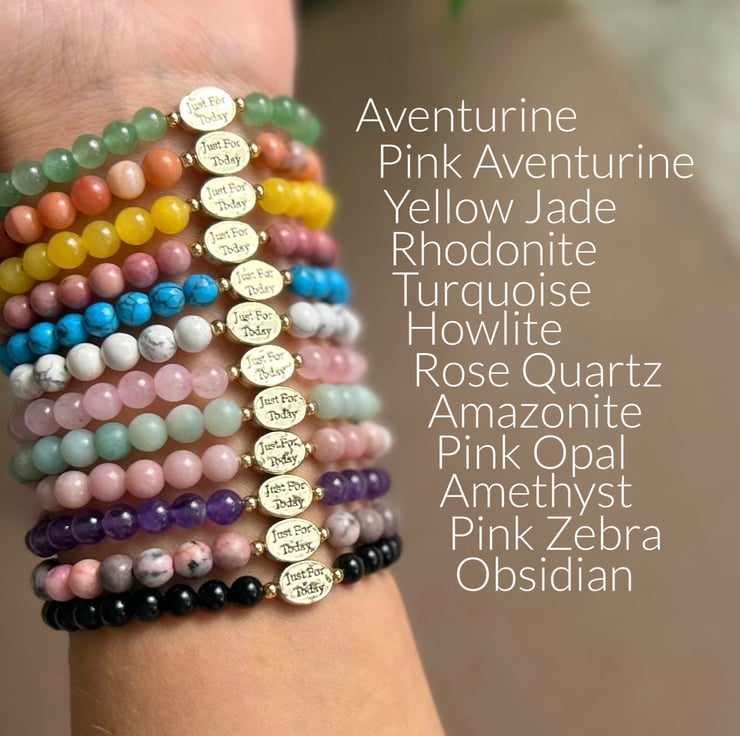 Celebrate someone’s (or your own) sobriety with this “Just for today” Gemstone bracelet and “Just For Today” Card. The golden charm sits between 14kt gold plated spacer beads and natural gemstones of choice. Comes with a Sobriety Backing Card I have designed and comes in a velvet protective pouch! Also includes a “Just For Today” Encouragement Card.