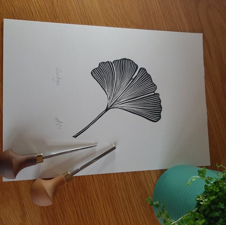 This is an original linoprint of a single black ginkgo leaf It is printed on A4 190 gsm off white paper. Each print is handpulled and so the print you receive may vary slightly to the one shown. I do try to accurately represent the colours used in my photos. The leaf is approximately 12 cm x 12 cm. Any frames or mounts shown are not included.