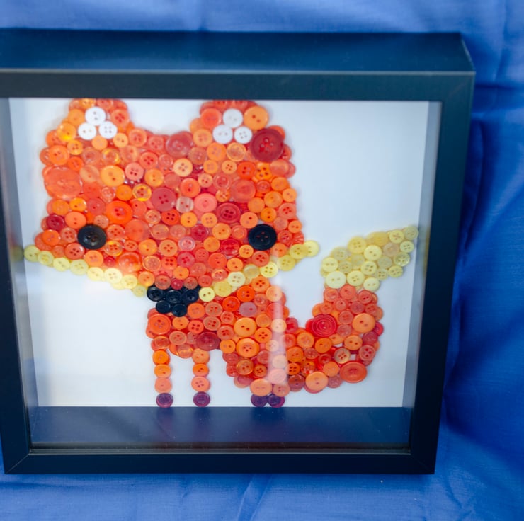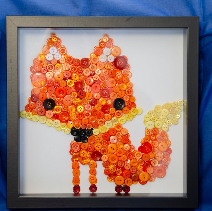 Handmade fox button picture, with loads of unique character. This button picture would make a great gift for a new baby's nursery wall, or for a cute piece of artwork for a child's bedroom.