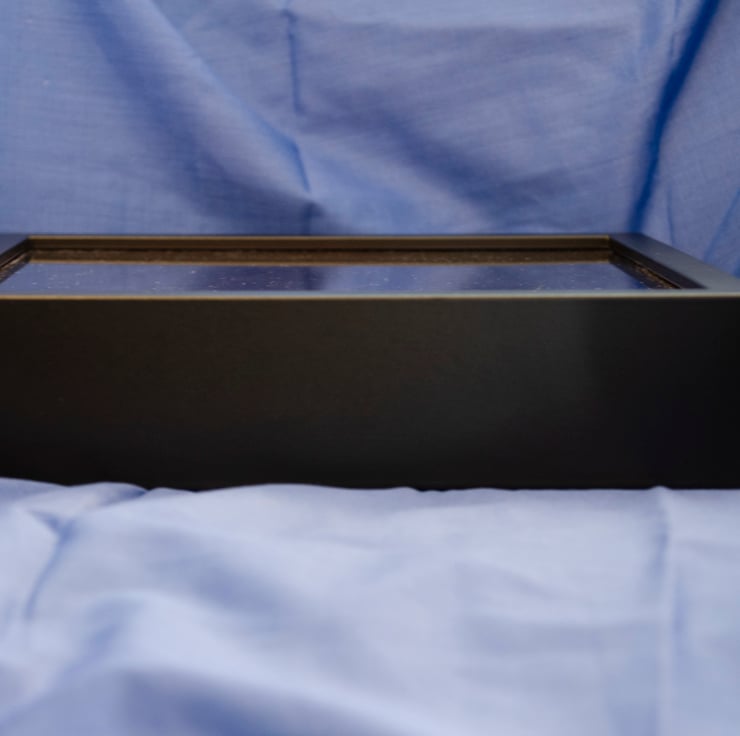 The frame is an IKEA 27x27x12cm black box frame and can be wall mounted or free standing. The picture itself is 25x25cm.