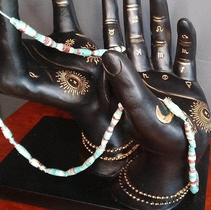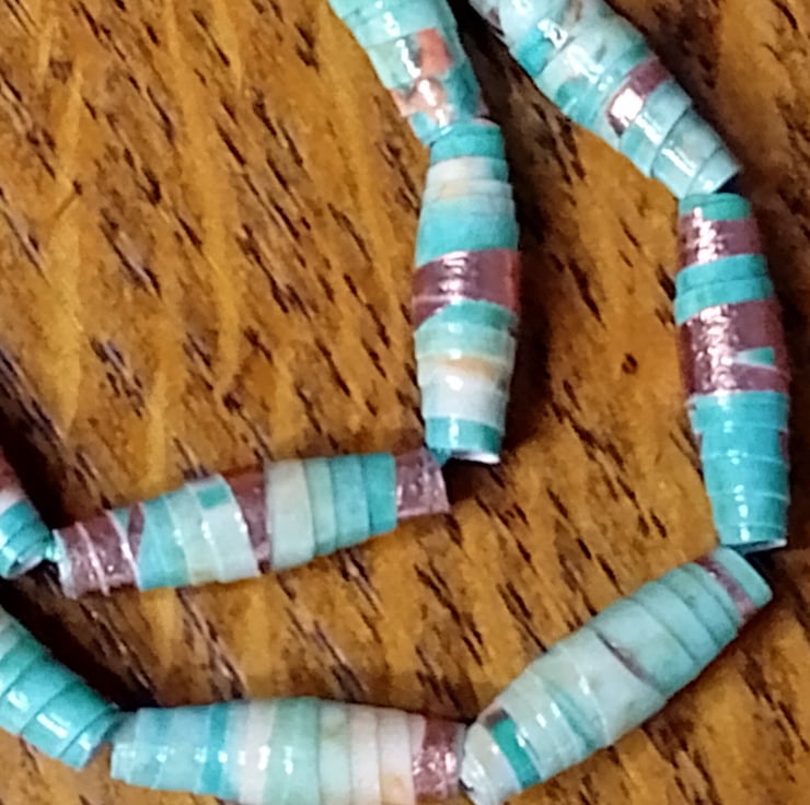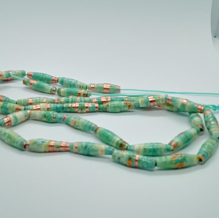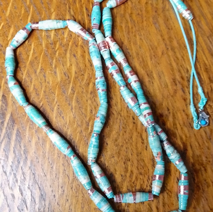 Breezy paper bead necklace, length and fastener making it wrappable.