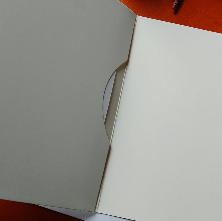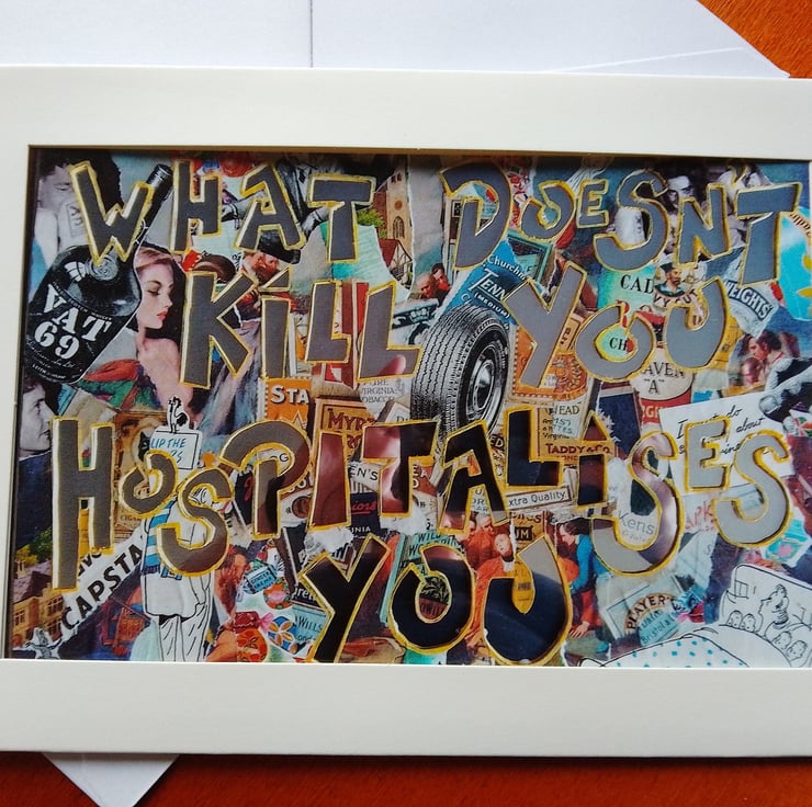 Photograph of an original collage, mounted in a greetings card, blank inside, with white envelope.