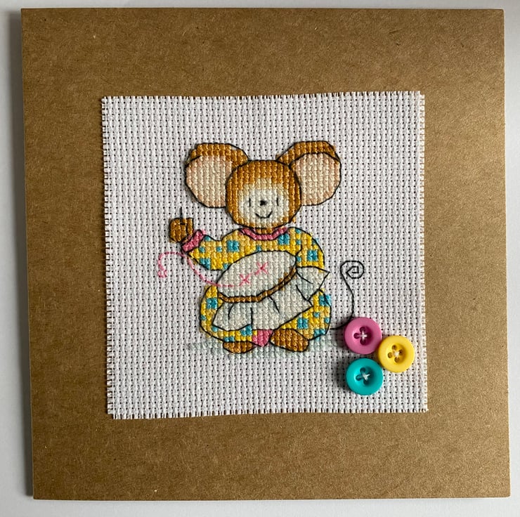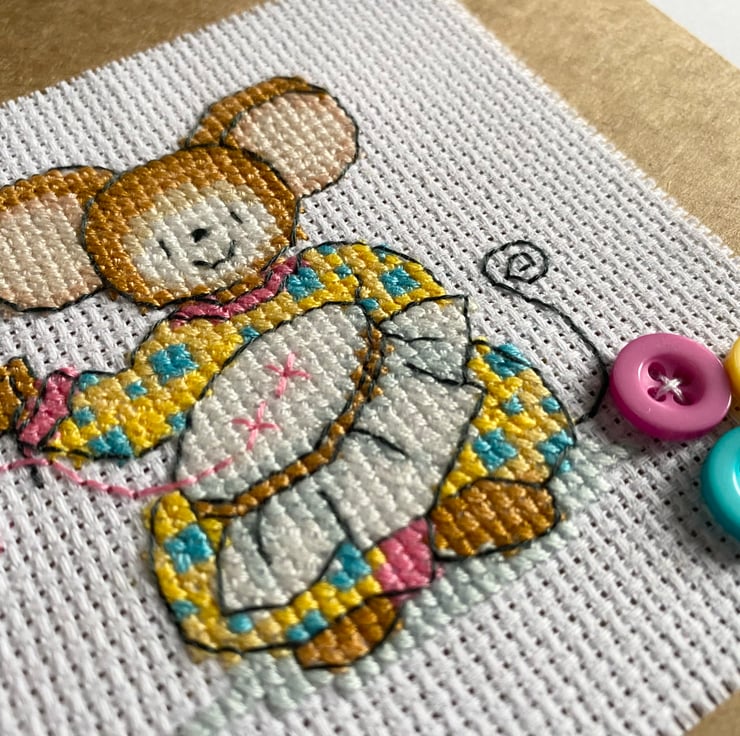 Super cute cross stitch design of a busy little mouse sewing in her hoop! Finished with colourful buttons for an extra splash of fun!