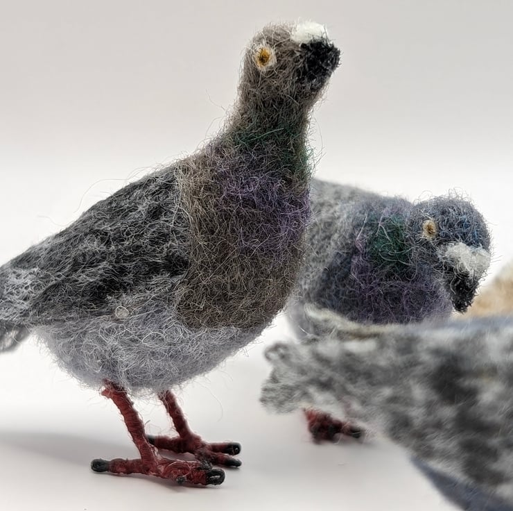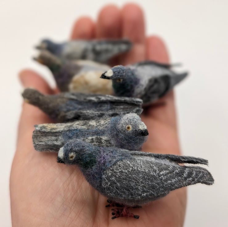 Pigeons are monogamous, can experiment in their youth with homosexuality, divorce if things are not going well, and mate all year round if they are feeling happy and well fed. What better way to celebrate human-love in all its wonderful shapes and sizes. I have a large church roof opposite my tiny house, and I see pigeons gathering throughout the day, chasing each other, billing and cooing. Every unique Tiny Pigeon's plumage, pose and colour has been seen on that church roof whilst I hand-made them.