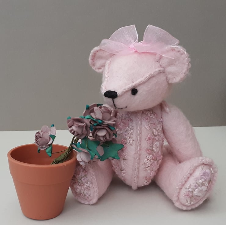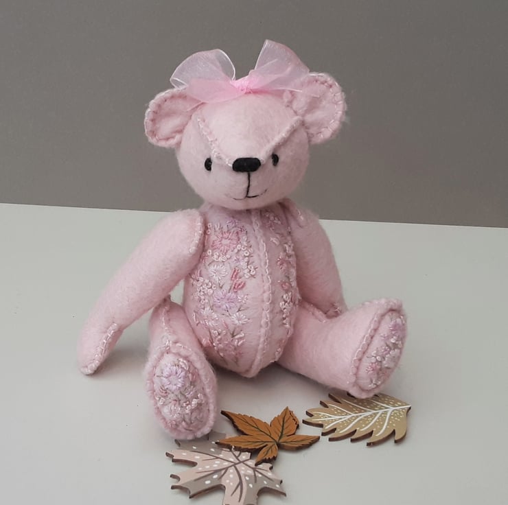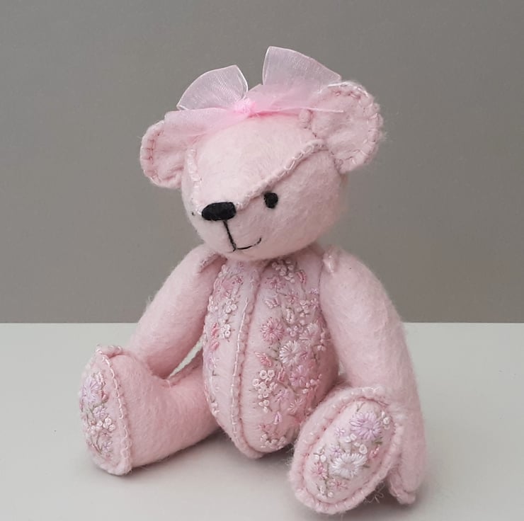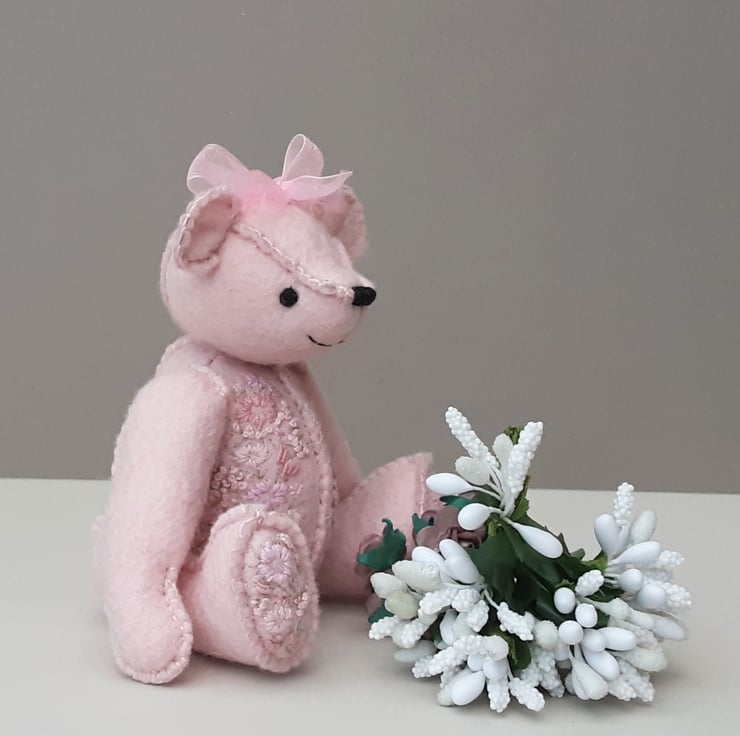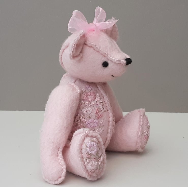 A small 5.75" tall hand sewn wool felt bear in pale pink with hand embroidery to body fronts and foot pads as per Gracie Bear and as discussed via messenger.