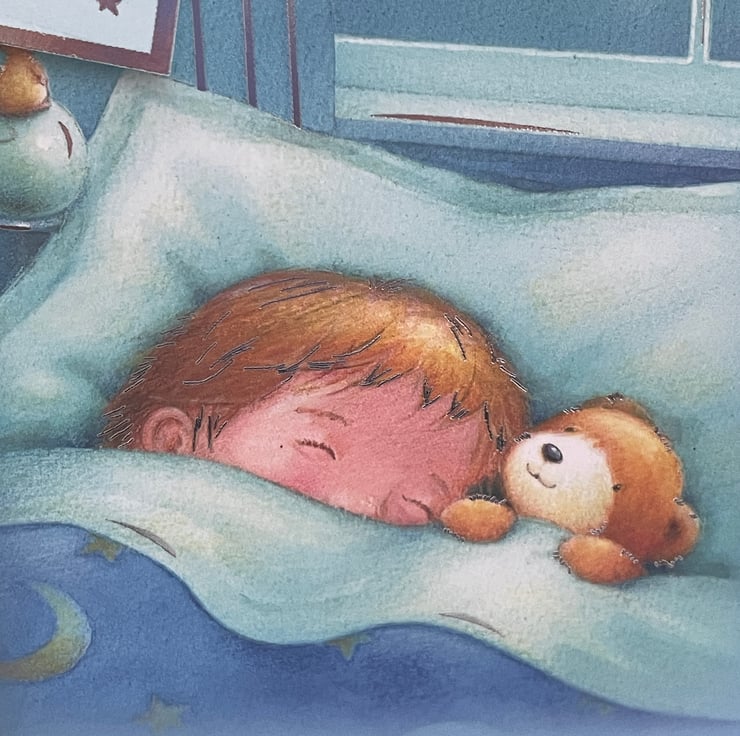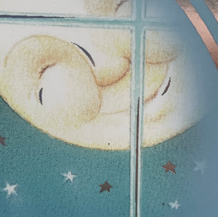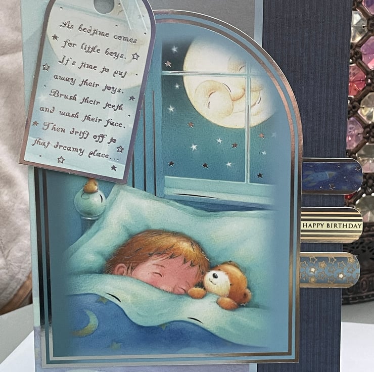 A gorgeous card for a little boys birthday. This A5 sized card features the lovely image of a sleeping boy under a cheerful moon. He is tucked up in bed with his teddy as a smiling moon looks on. A little mouse is gazing at the moon. This is complimented with a poem on a tag - As bedtime comes for little boys, it's time to put away their toys, brush their teeth and wash their face, then drift off to that dreamy place.... The design is finished with a ribbon on the tag, a blue button and 3 banners featuring a spaceship, stars and happy birthday. Inside is blank for your own greeting.