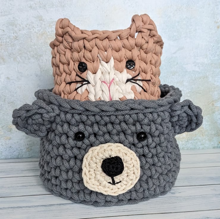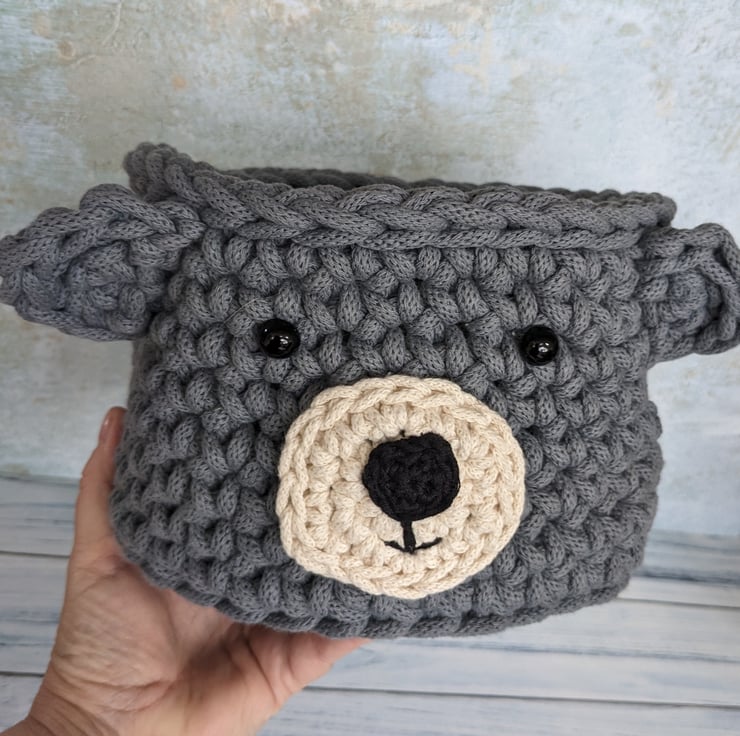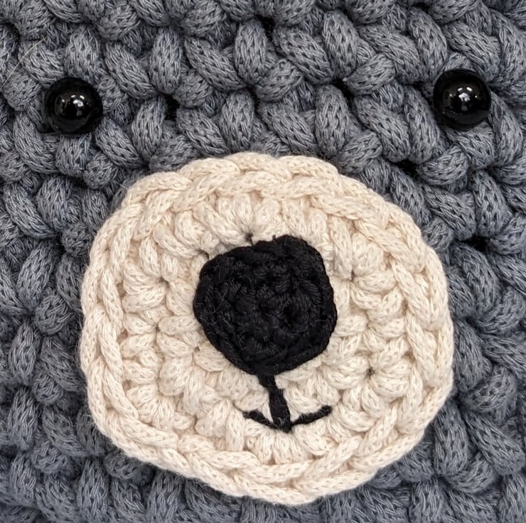 The bear's muzzle is crocheted separately and sewn securely to the side of the basket. The nose is crocheted and the mouth is embroidered using cotton yarn, The eyes are domed plastic buttons, hand sewn on using extra strong cotton thread.
